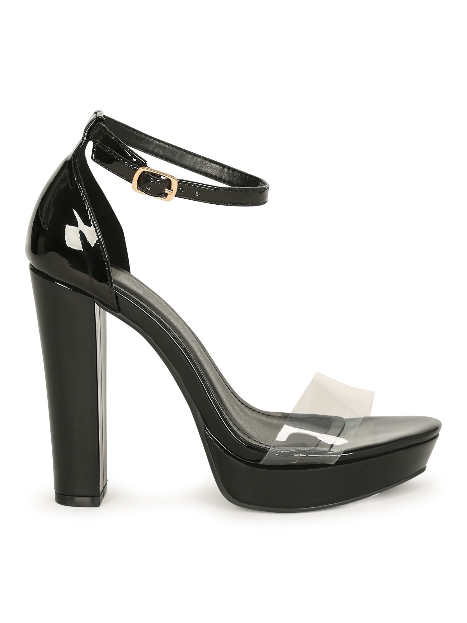 These Platform Peep Toe Heels feature transparent straps and a chunky platform sole that creates an illusion of height. The peep toe design adds a playful touch, while the buckle closure ensures a secure and comfortable fit. These versatile heels have a glossy finish, adding a touch of sophistication to your wardrobe. Wear them with your favorite summer dress or dress them up for a night out on the town. They are perfect for making a statement wherever you go. Chunky Heel Height is approx: 4.5" Platform Height is approx: 1"