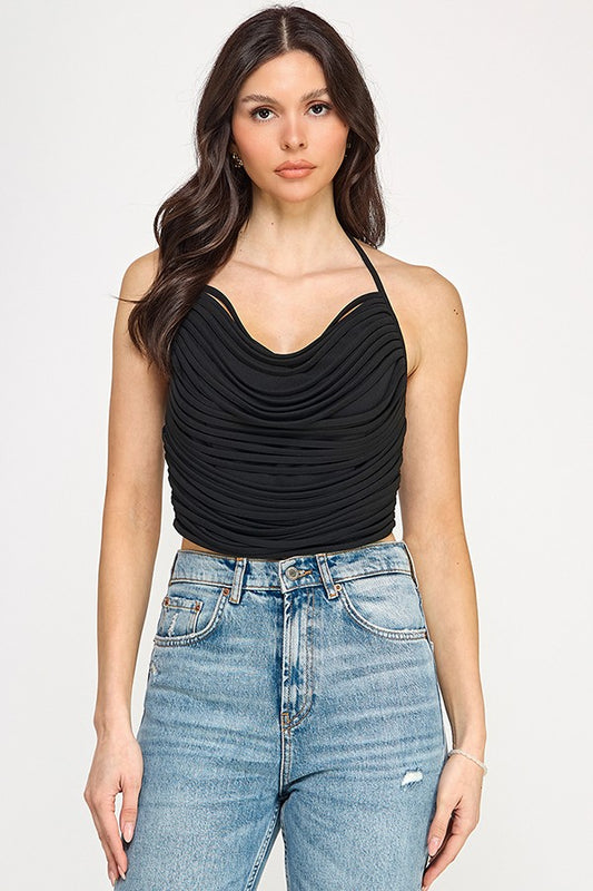 Gold Accent Draped Cowl Neck Sleeveless Top