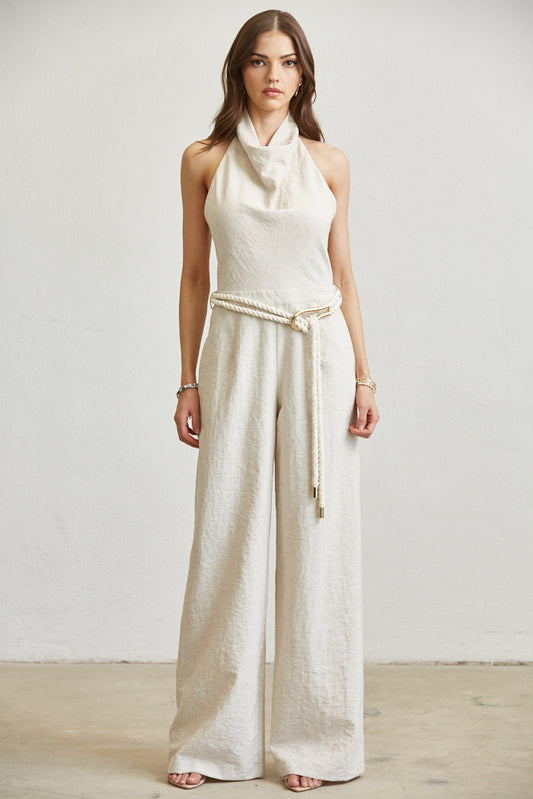 Asymmetric Draped Belted Sleeveless Jumpsuit