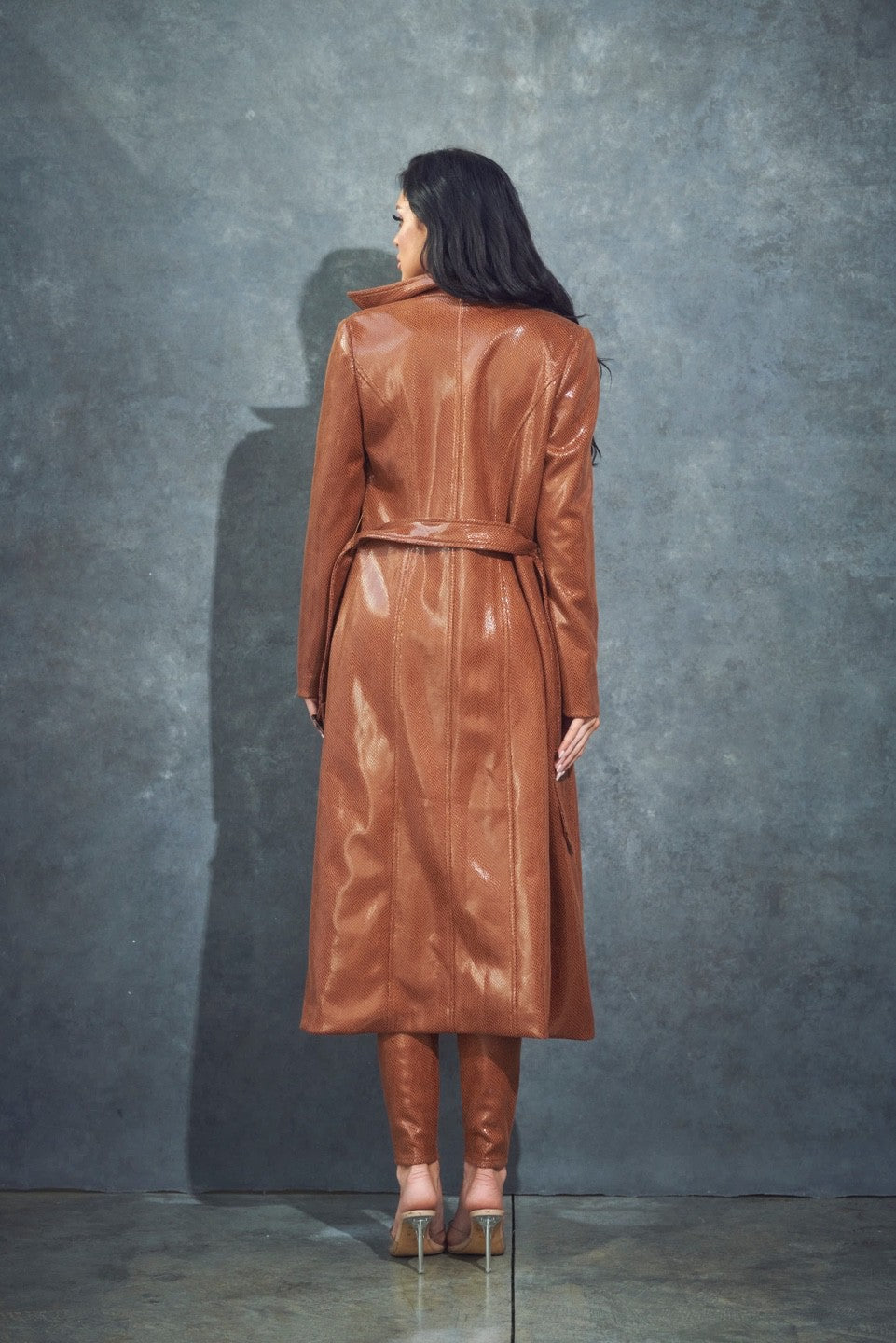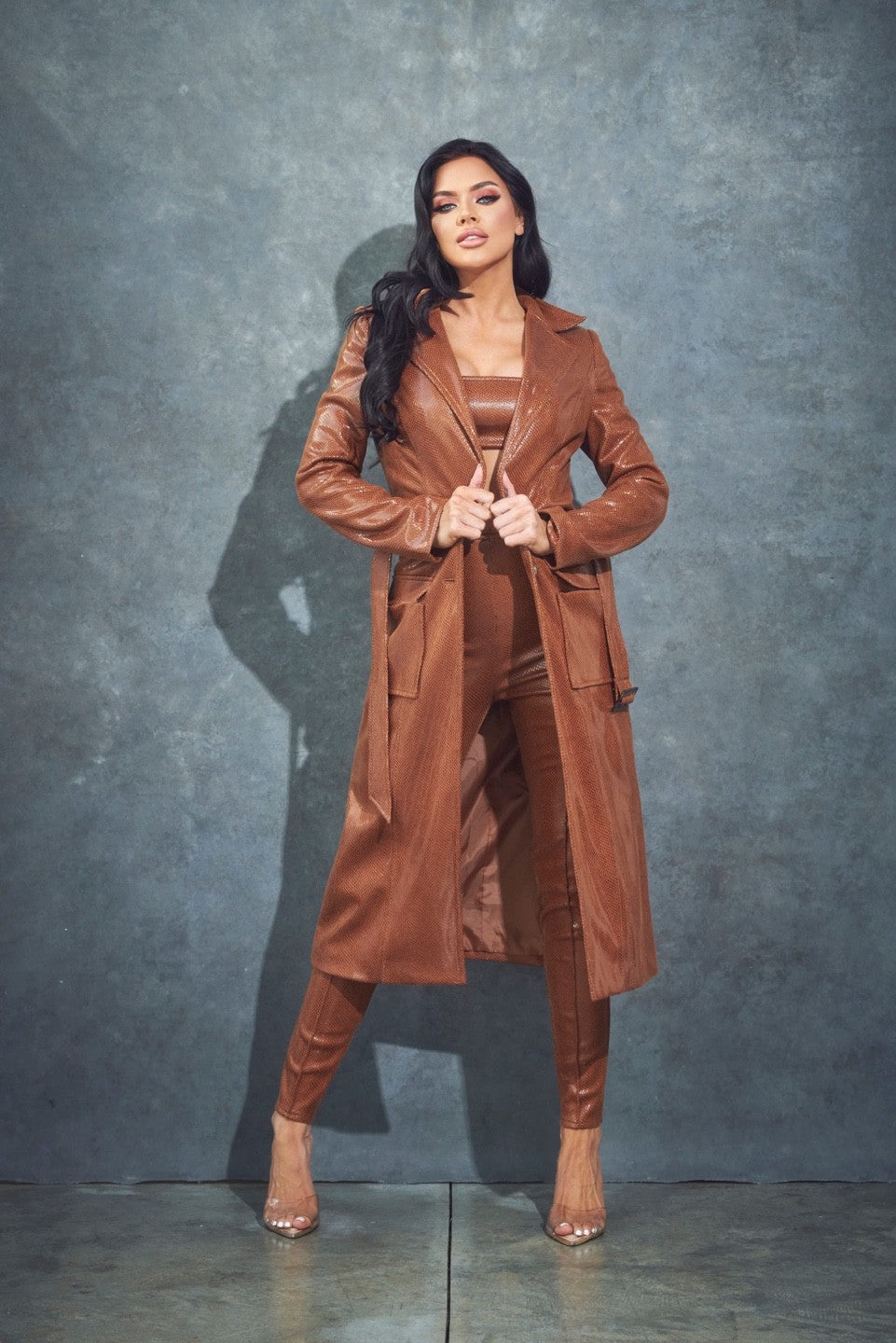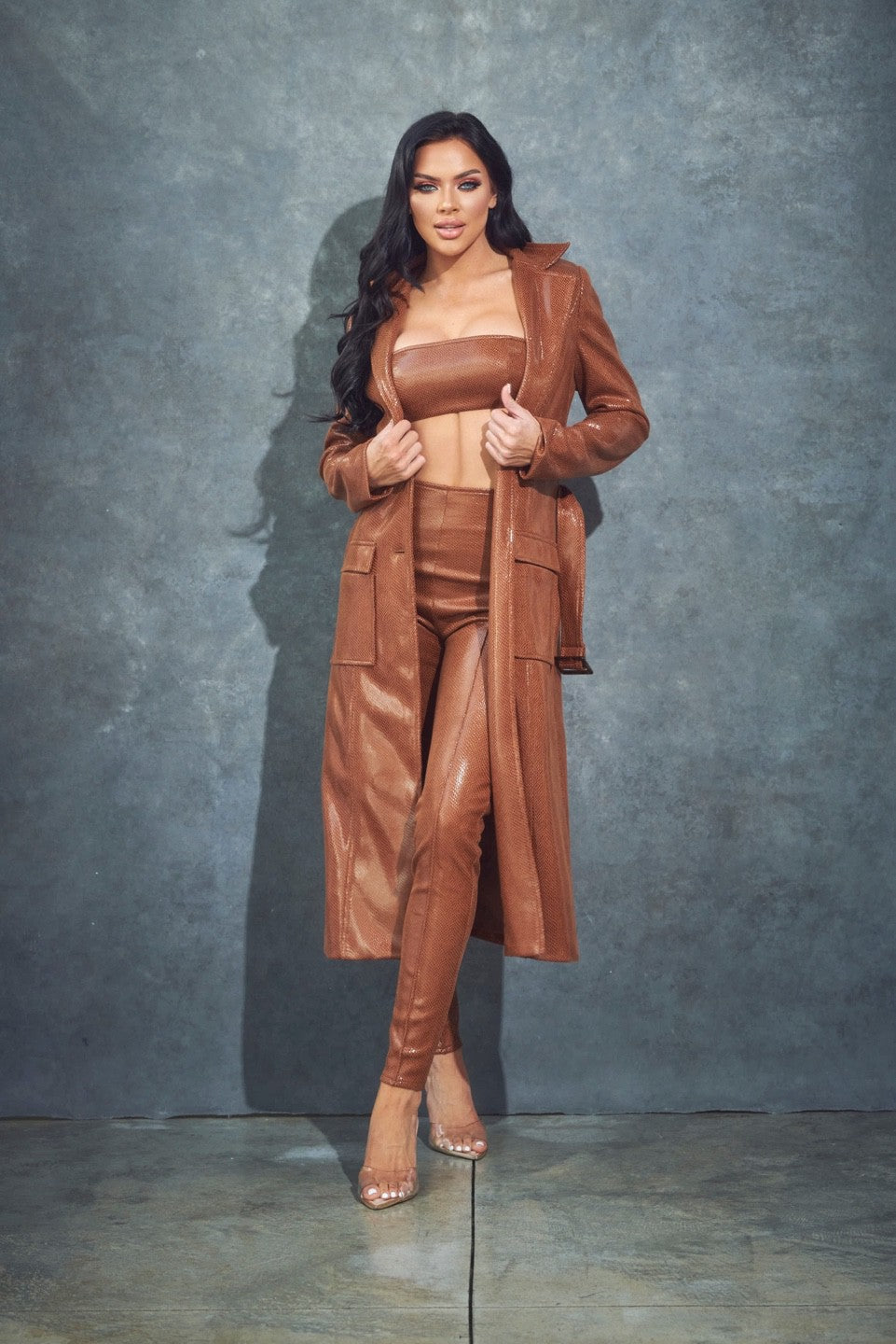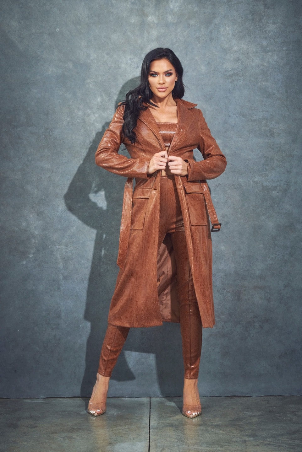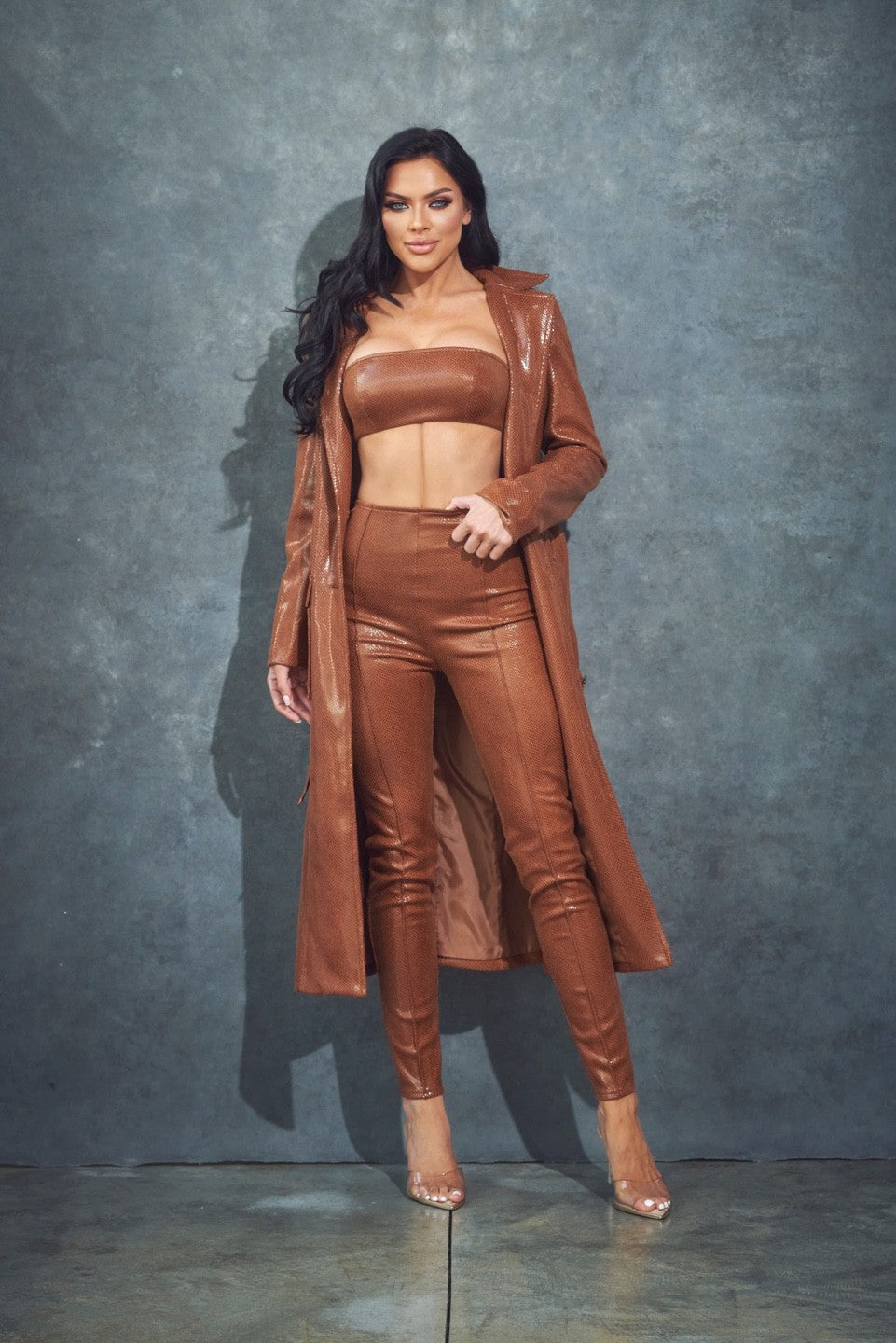 3pc set- faux leather embossed crocodile tube, leggings, & trench