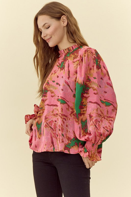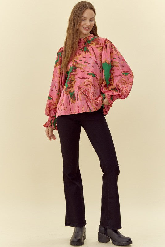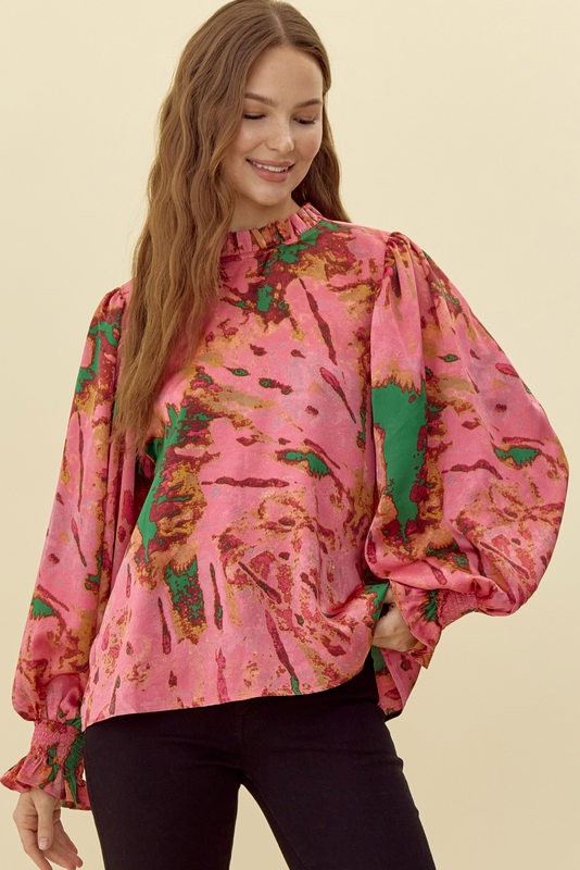Abstract print top with feminine frilled neck, back key hole featuring shirring, long peasant sleeves, and smocked frill cuffs. - Non-sheer, lightweight. - Model is 5'10'' and is wearing a Small.