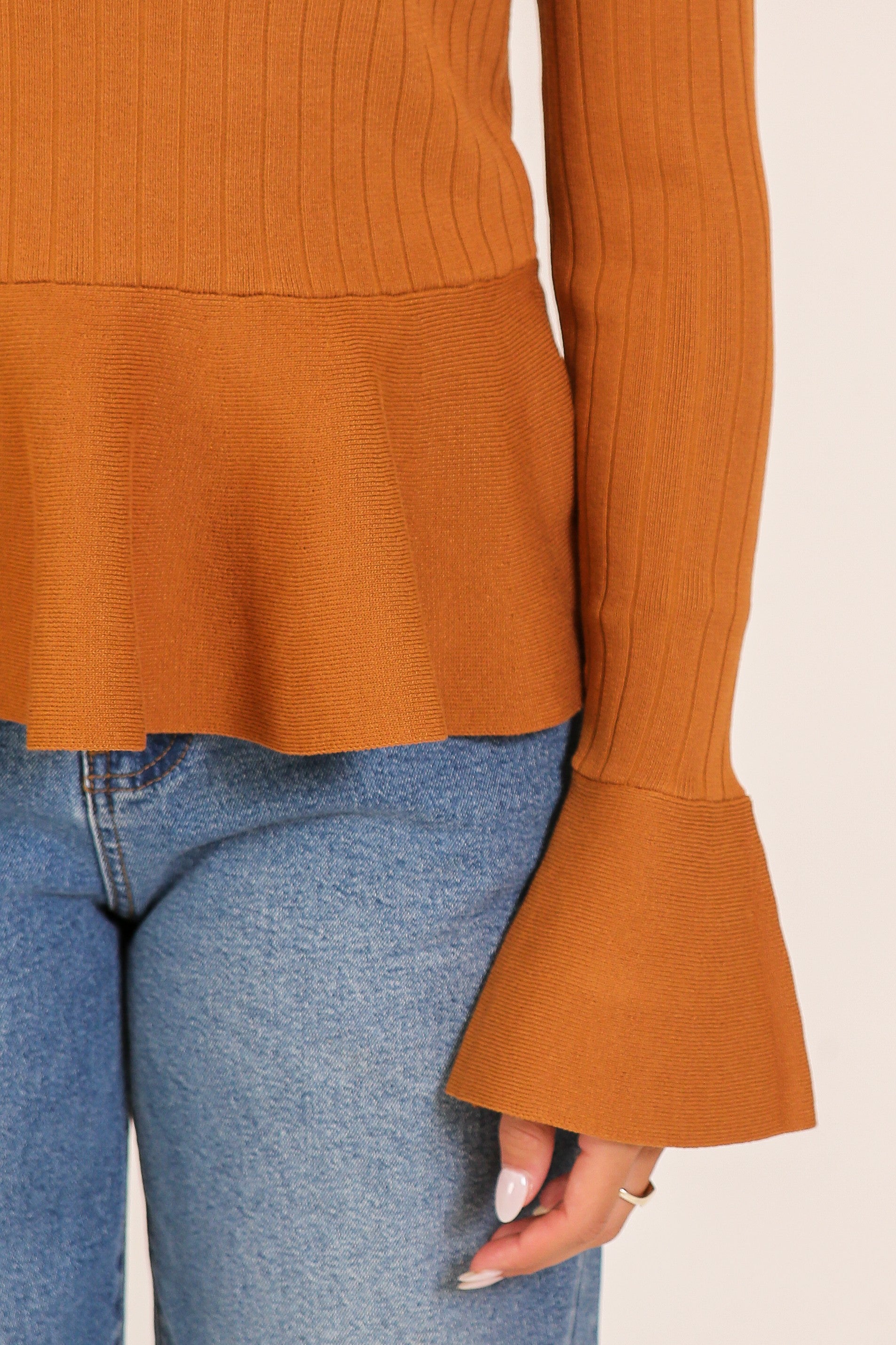 Add a touch of feminine flair to your everyday wardrobe with our Ribbed Knit Peplum Sweater Top. This flattering, long sleeve knit features a structured ribbed bodice that hugs the figure, while the flared peplum hem adds movement and a playful silhouette. Subtle bell cuffs elevate the look with a chic, vintage-inspired twist. Designed with comfort and style in mind, this soft and stretchy top pairs effortlessly with jeans, trousers, or skirts-perfect for both workdays and weekends. Available in two elegant shades: classic Cream for a clean, versatile look, and rich Rust for a bold, earthy vibe. Ribbed knit fabric with stretch Long sleeves with flared bell cuffs Flattering peplum hemline Round neckline