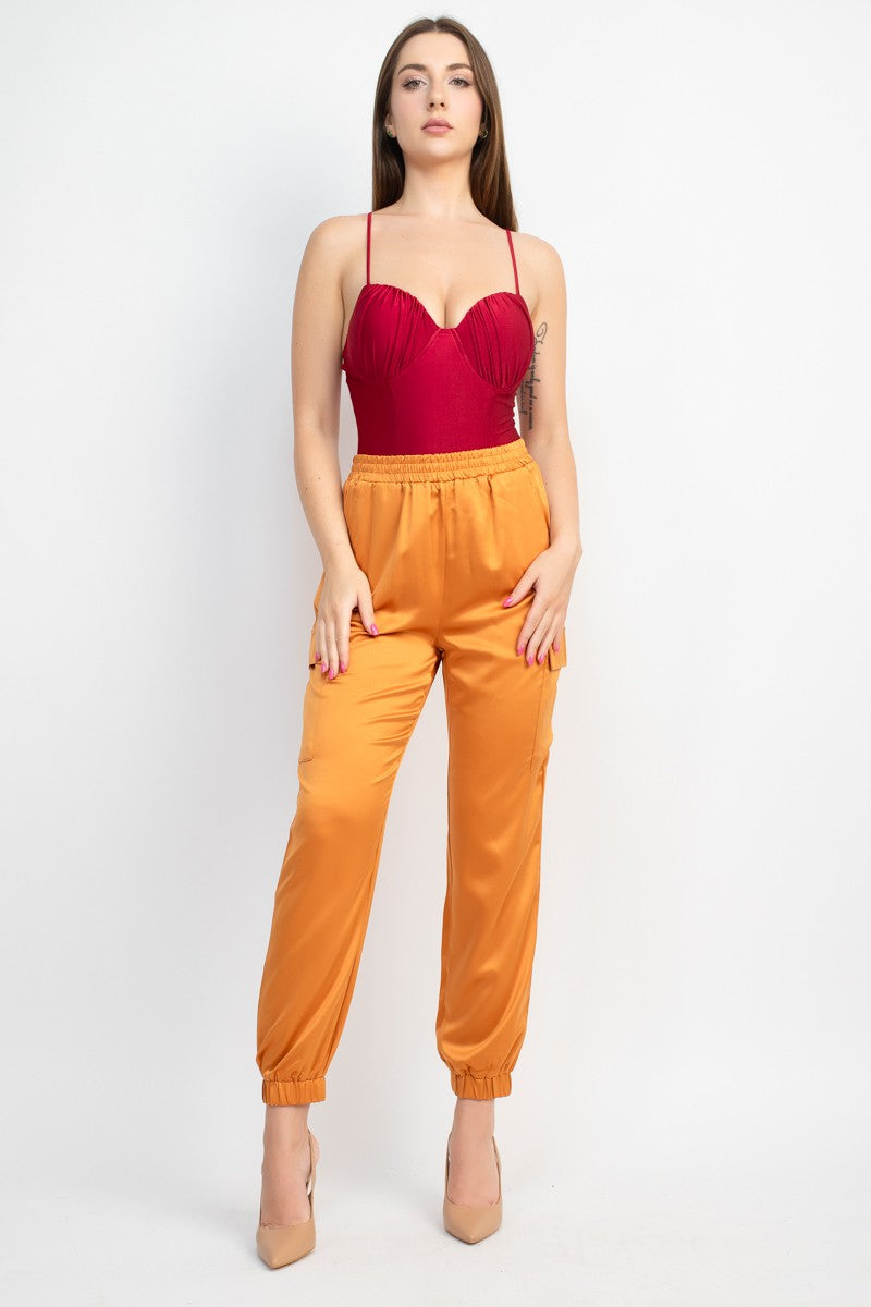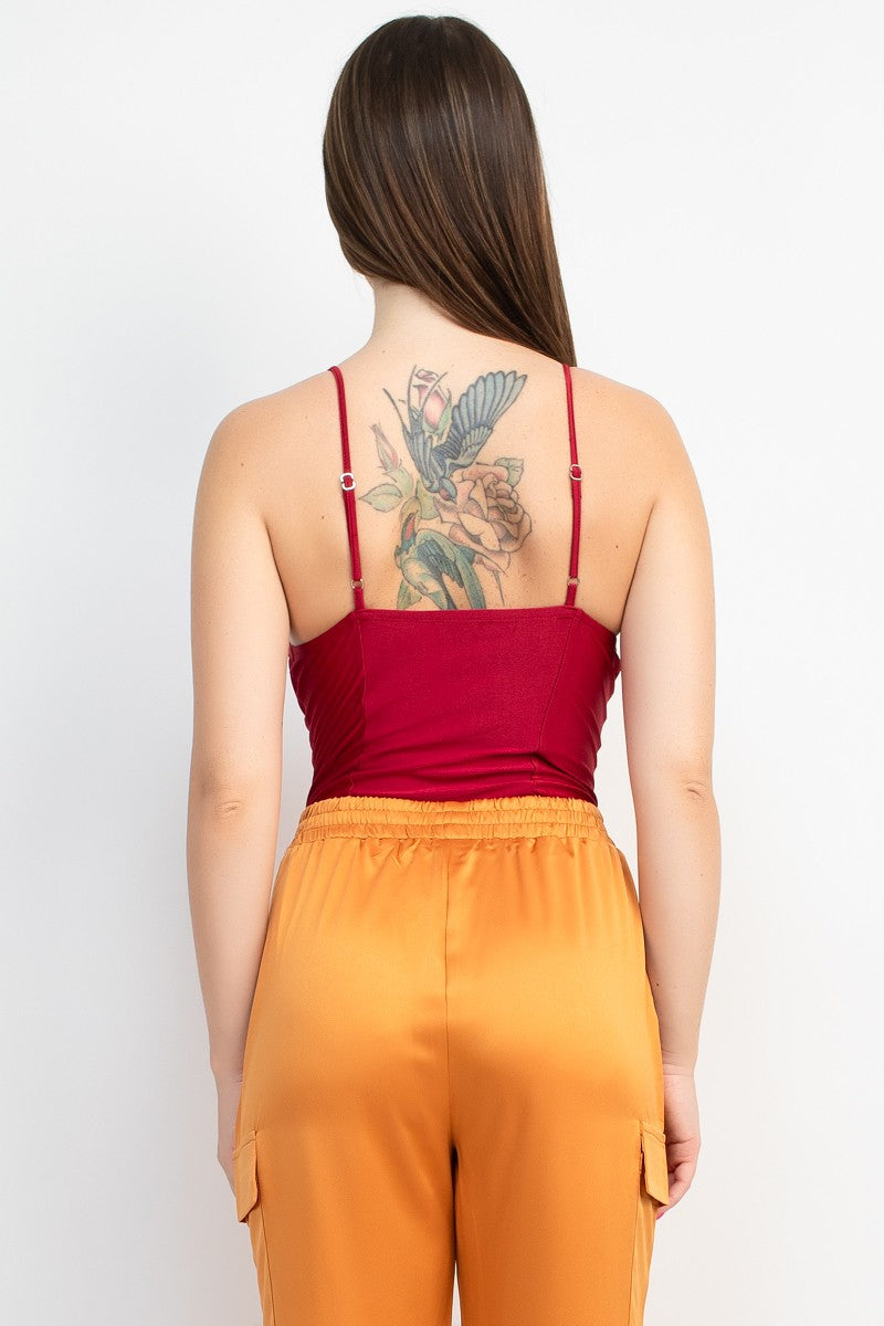 A knit bodysuit top in a satin fabric with impeccable new fall fashion trend featuring a solid color, a bustier design with a sweetheart neckline, ruffled details, sleeveless, and adjustable cami straps. Made in Cambodia