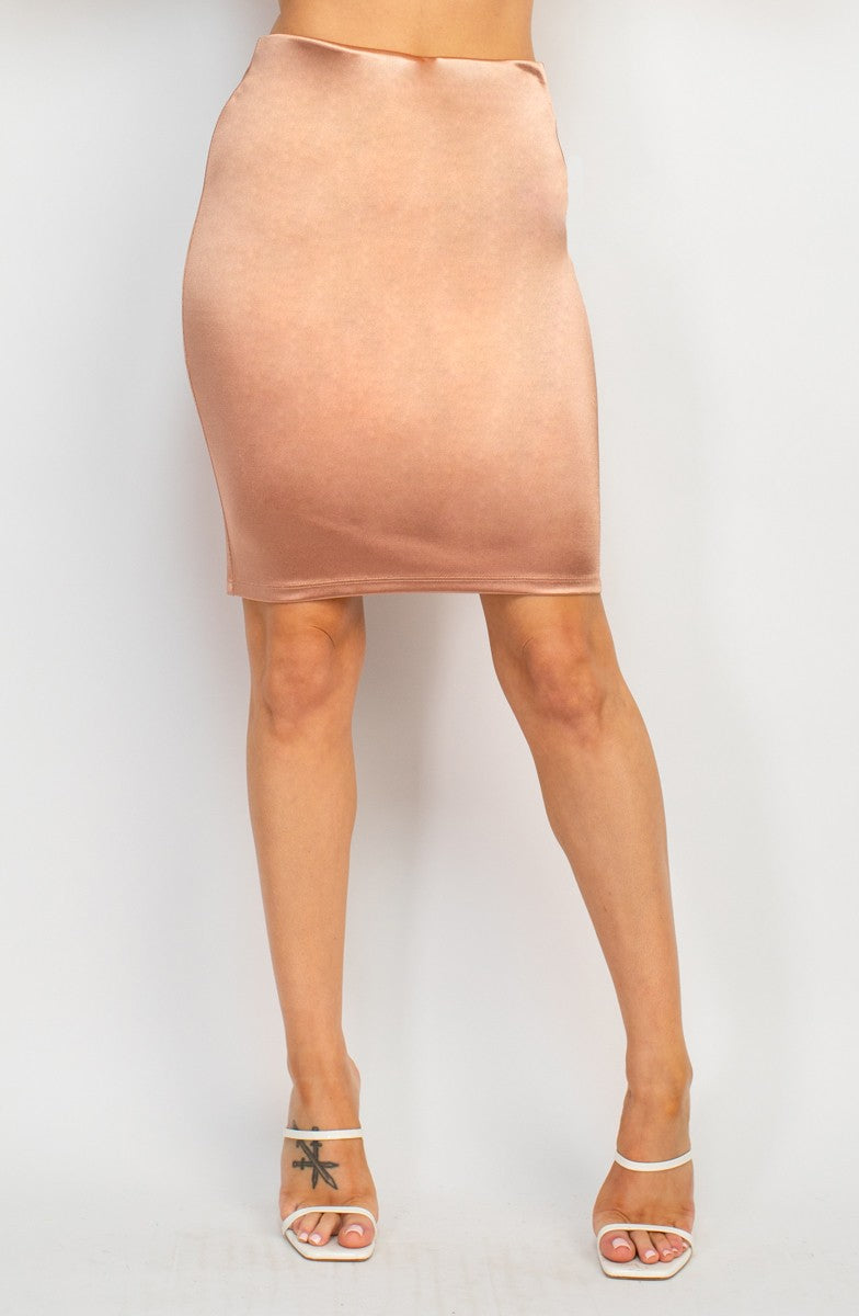 An elastic pencil skirt in solid color with breezy sophistication featuring high waist, back slit, knee length, and a fitted silhouette. Made in Cambodia