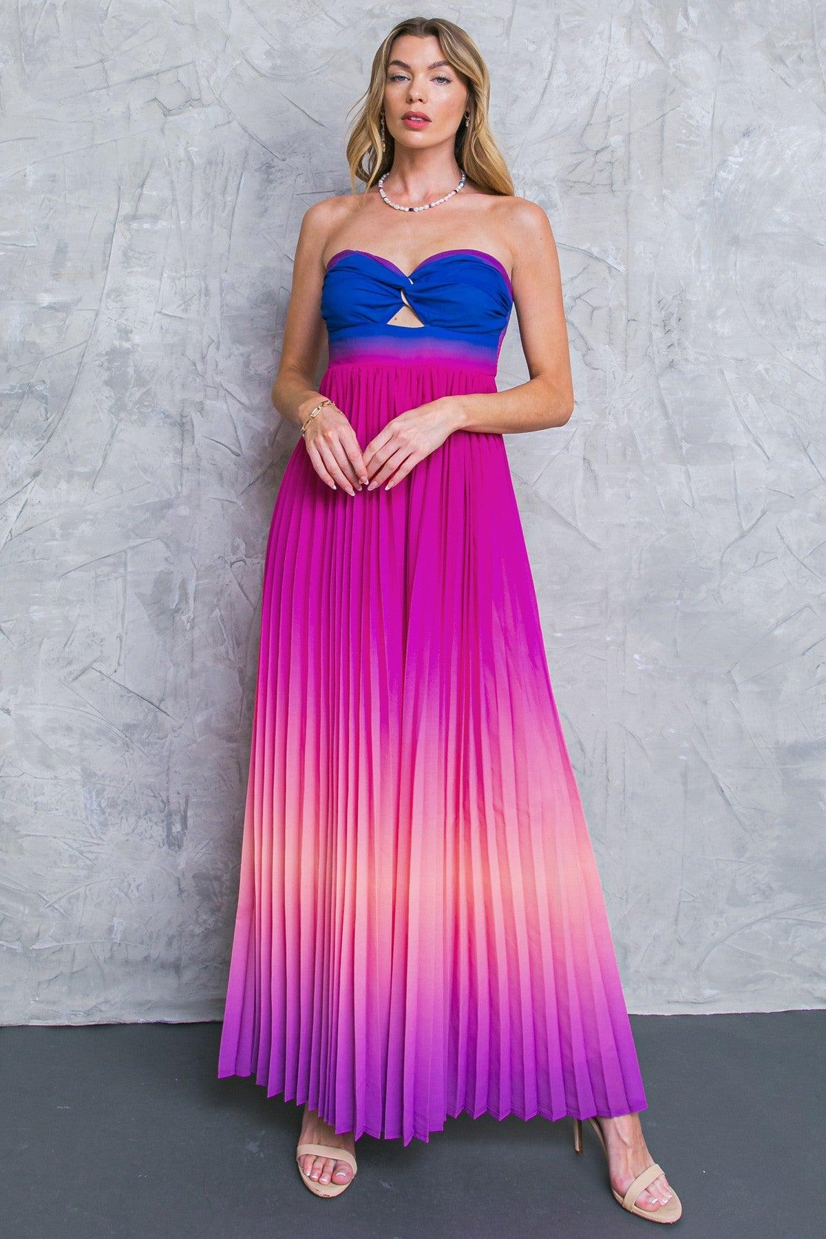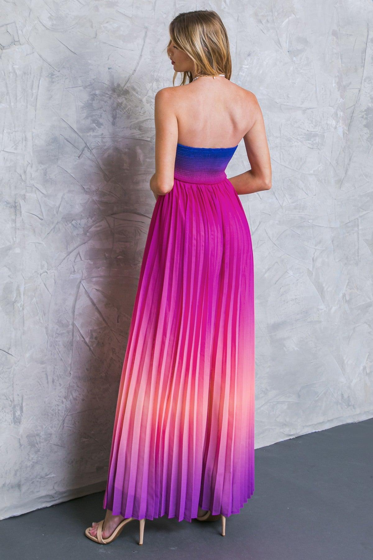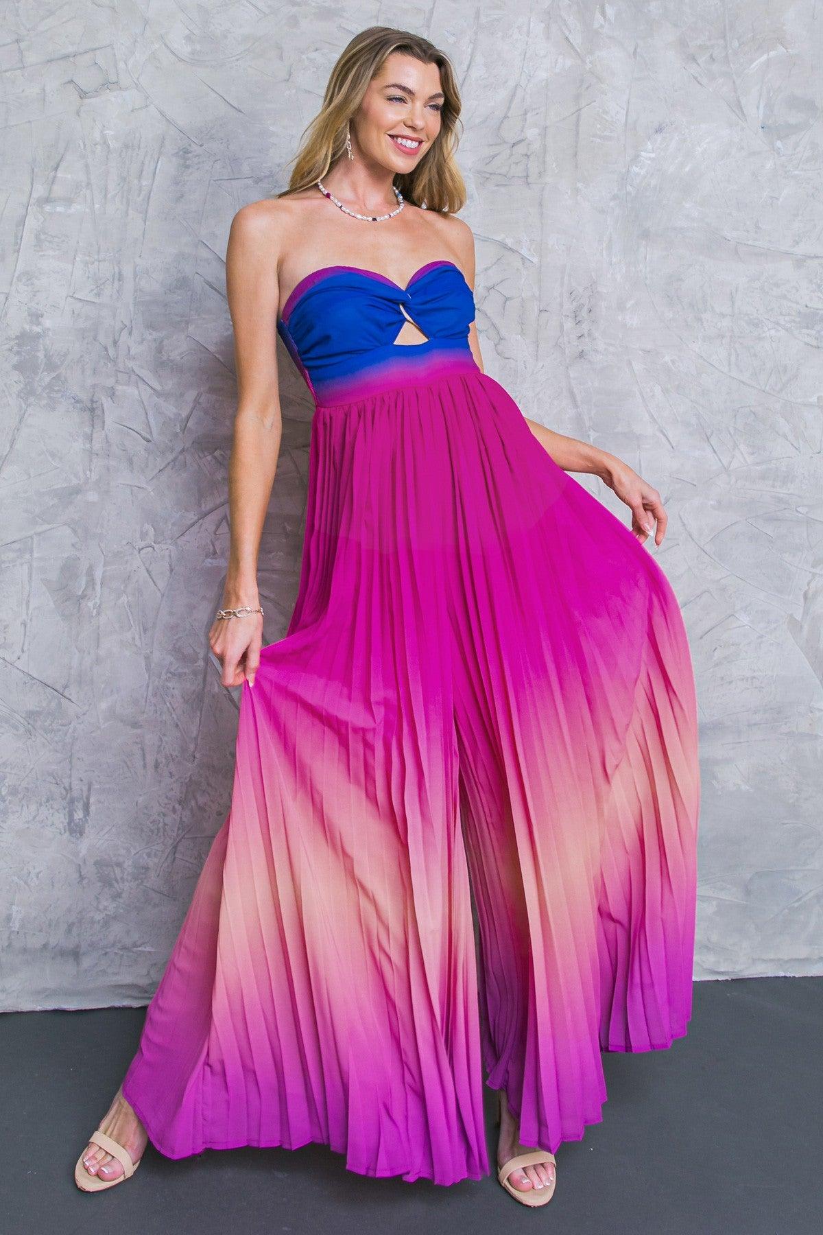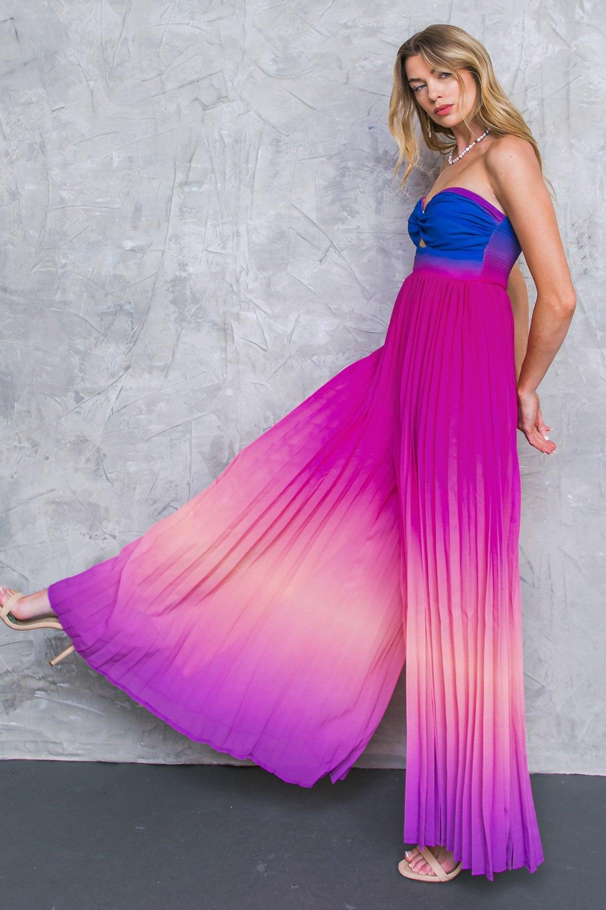 Pleat bottom twisted bodice strapless ombre wide leg jumpsuit