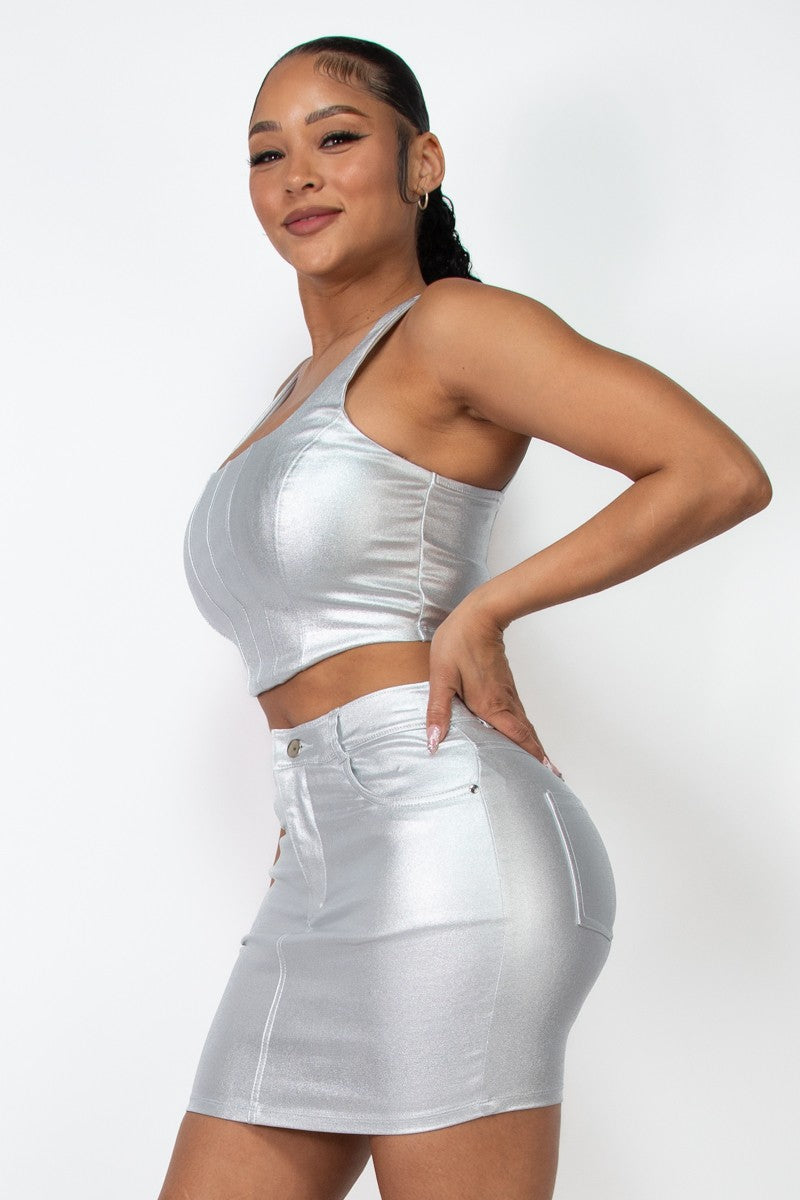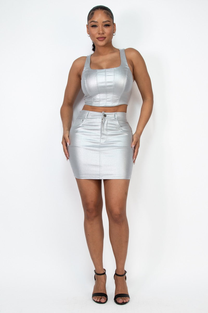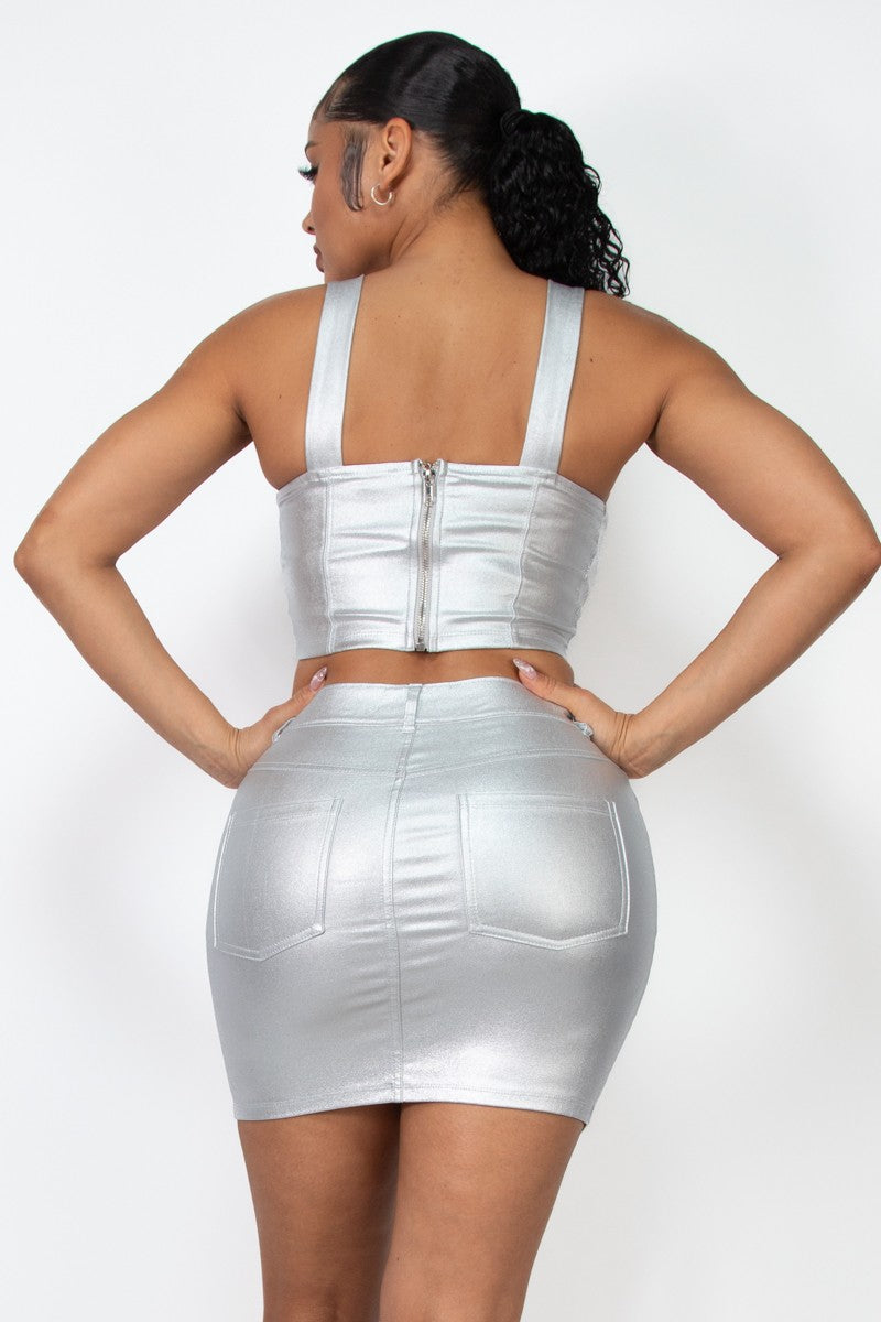 A foil and elastic bustier corset twill top with glossy texture and a trendy fashion featuring wide straps, square neckline, back zipper closure, and a cropped length.