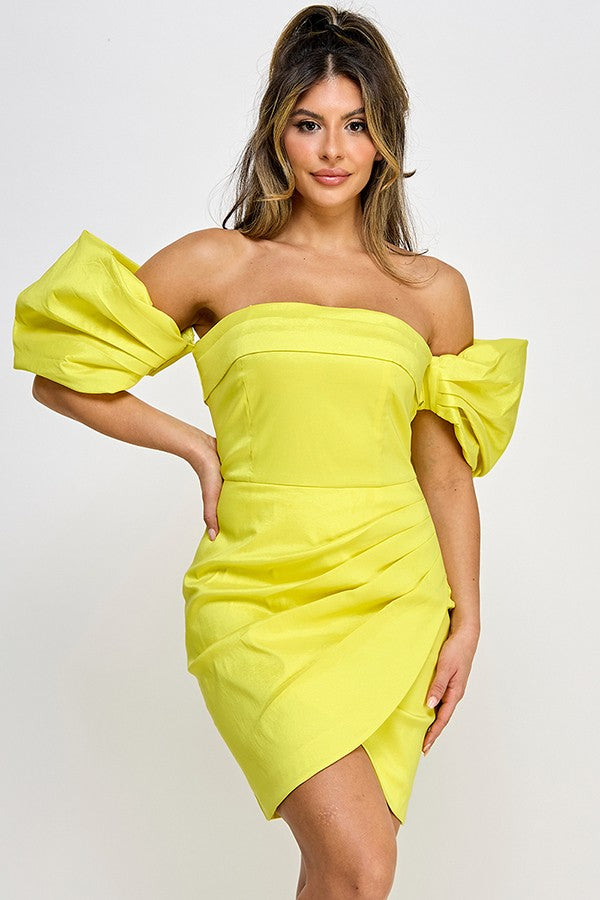 Off Shoulder Puff Sleeve Tulip Hem Mini Dress