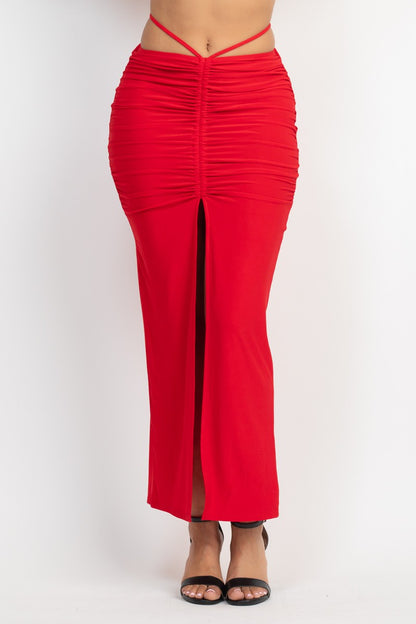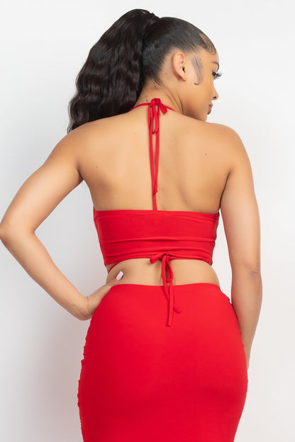 2pc set- cowl neck crop top & ruched slit maxi skirt