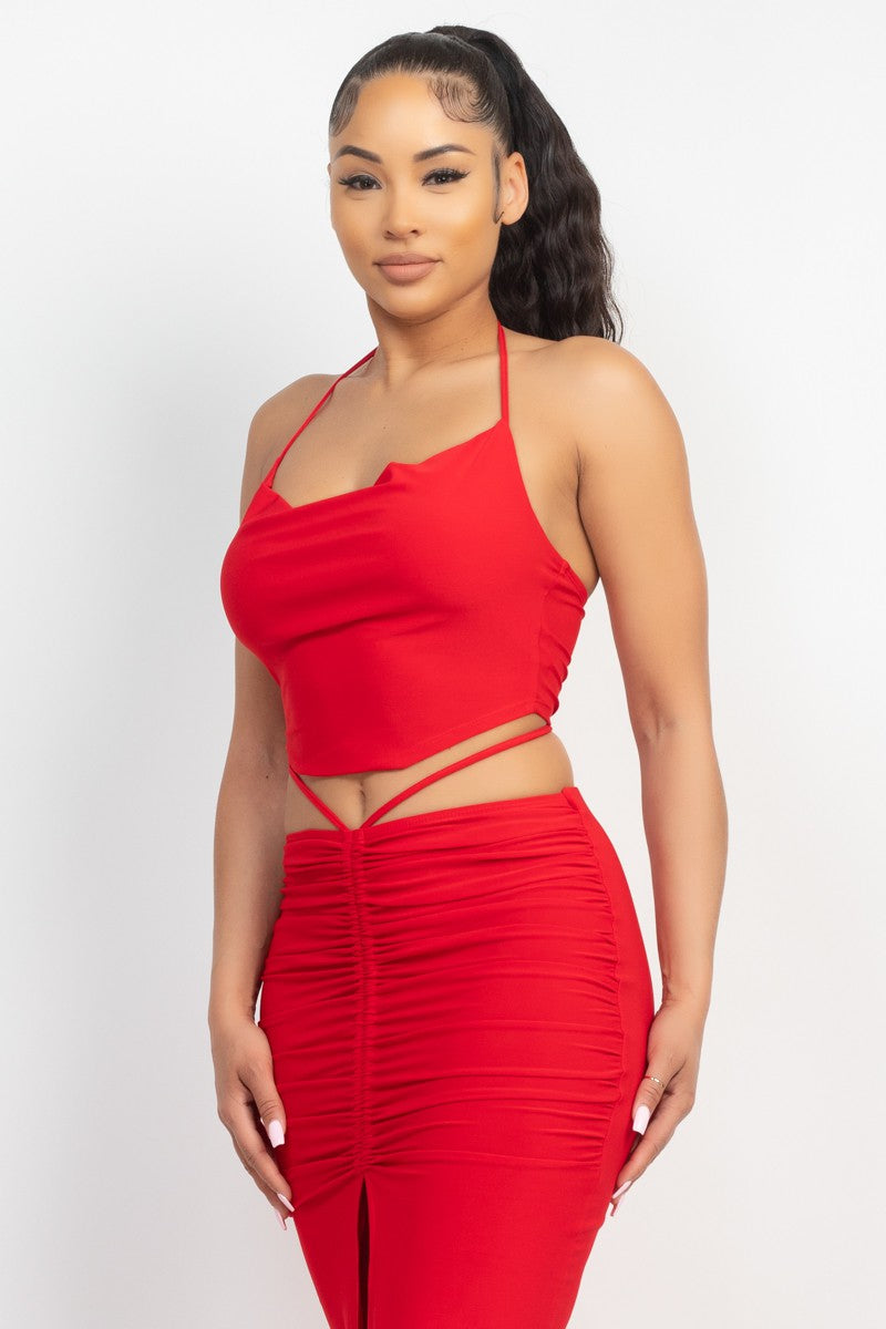 Cowl Neck Crop Top & Ruched Slit Skirts Set