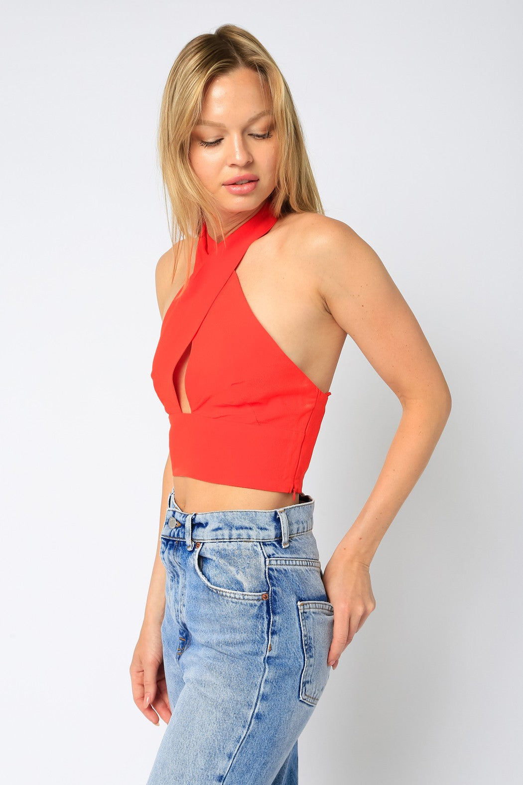 Our Solid Halter Cropped Top features a side zipper and a wrap style top. Woven. Model's Measurements Height 5'8" I Bust 32 I Waist 23 I Hips 34 I Size S