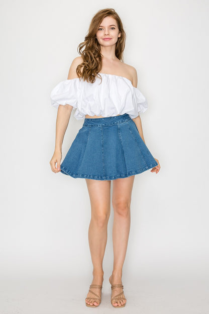 A fashionable and elastic denim skirt featuring high waist, exposed hem, A-line, inner shorts, back zip-up and button closure, and a mini length. Made in Vietnam