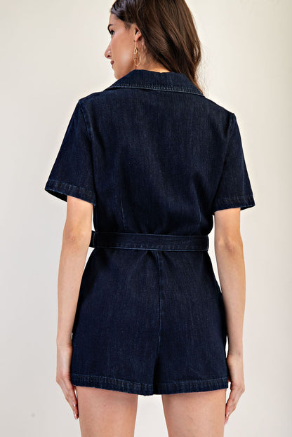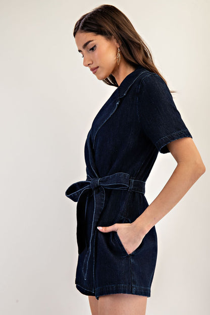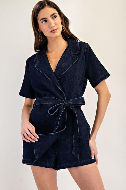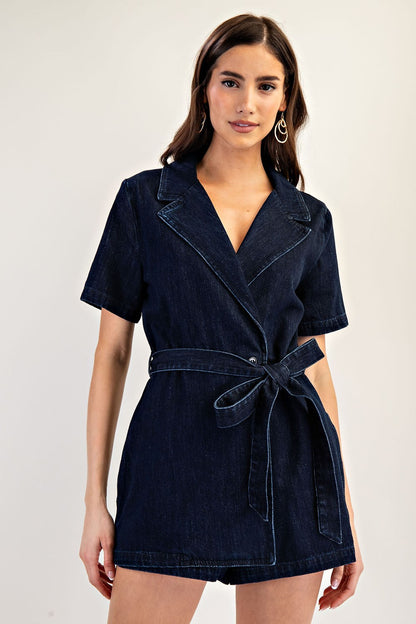 denim collared surplice belted romper