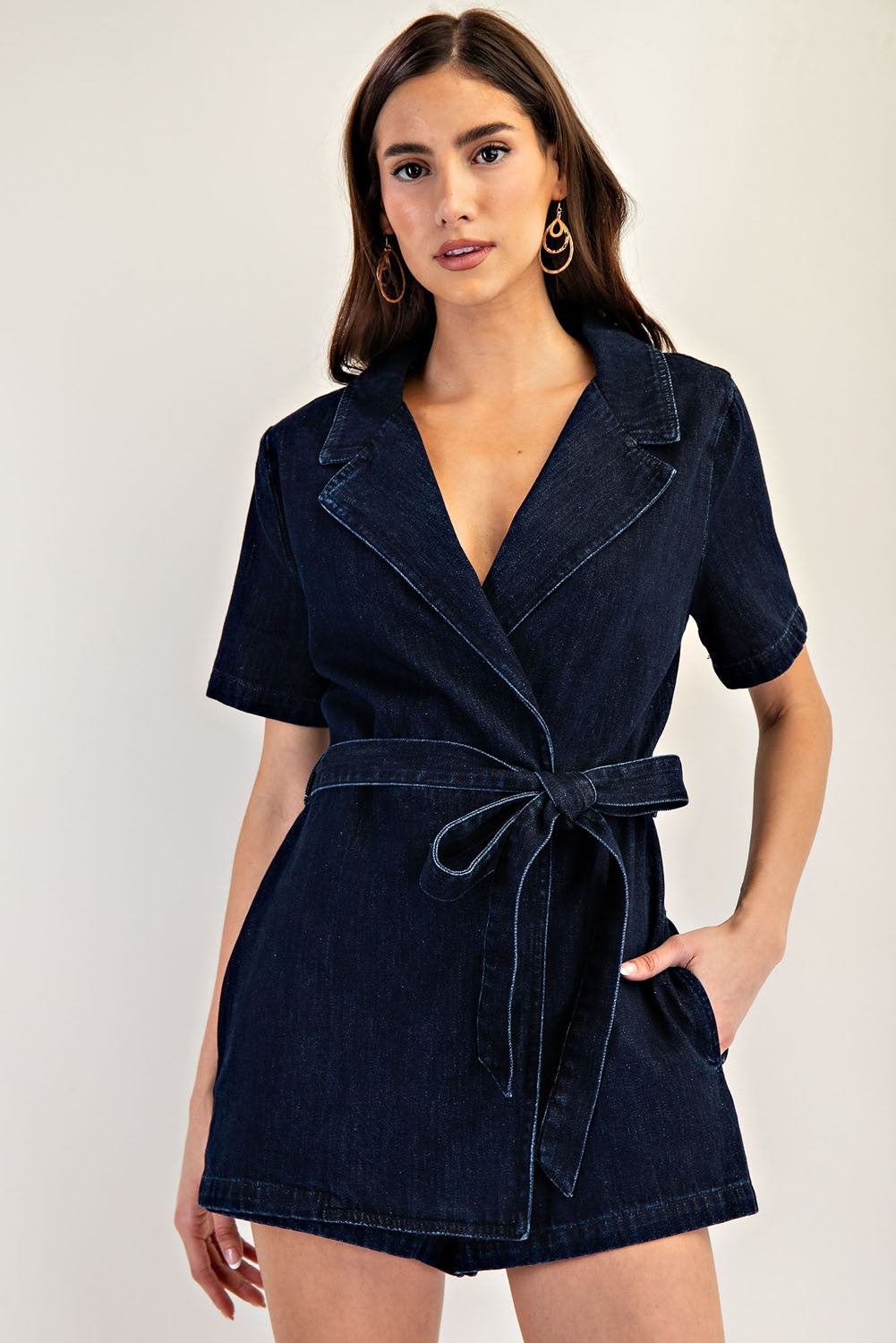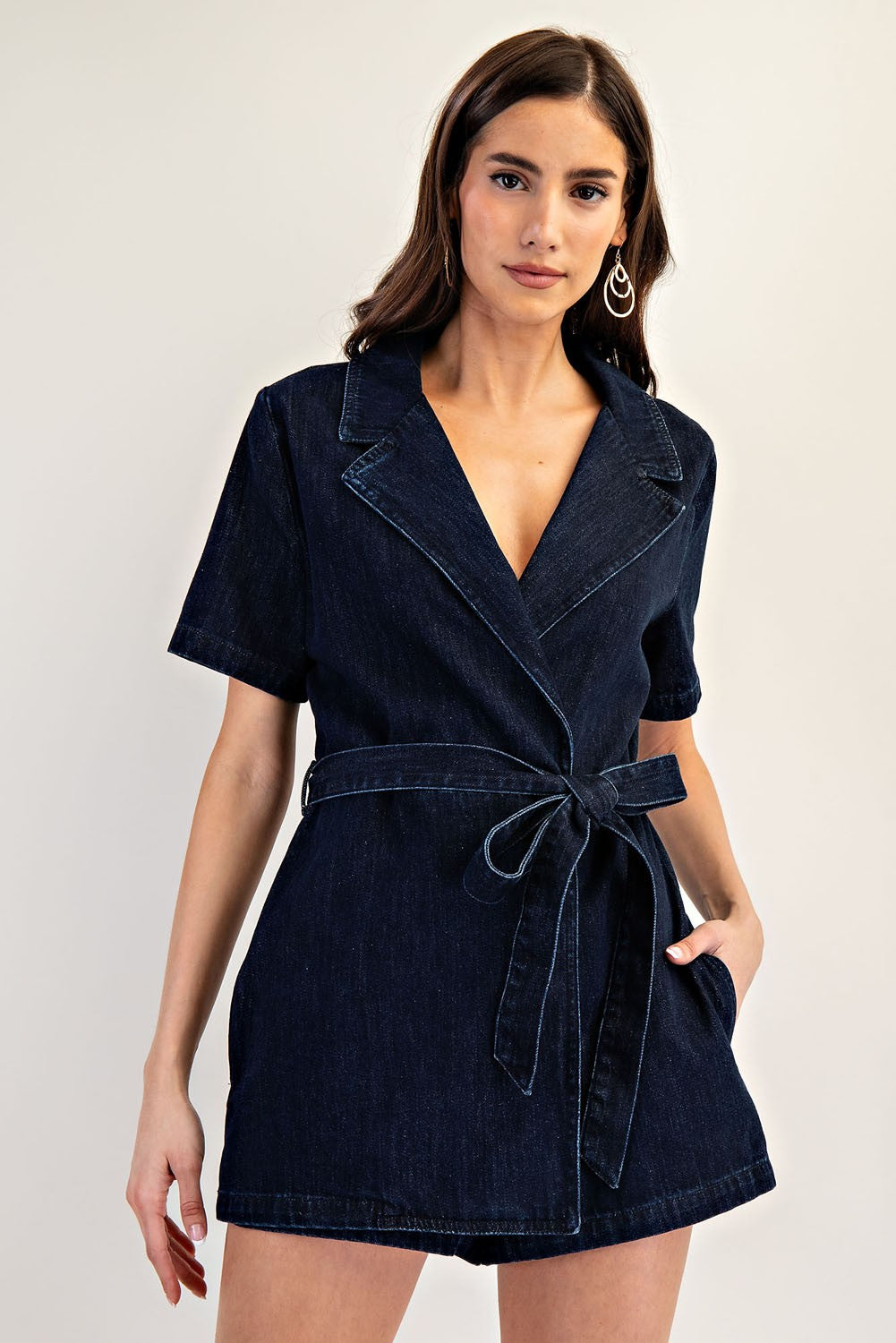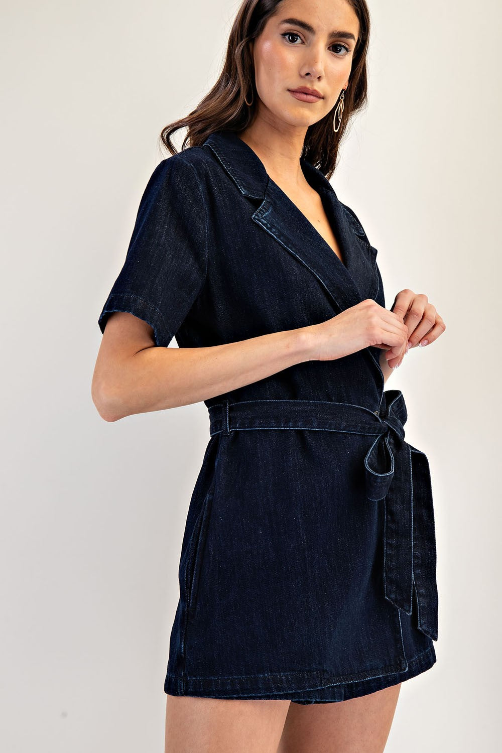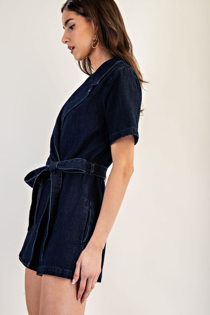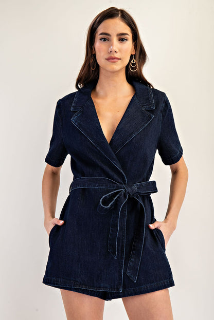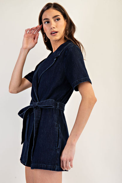 This mineral washed denim romper features a structured notched lapel, short sleeves, a tie waist belt for a customizable fit, side pockets for functionality, and a front wrap design that gives the illusion of a dress from the front, blending casual charm with polished style. Model is 5'9" and is wearing a small.