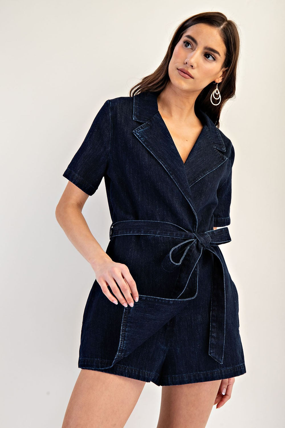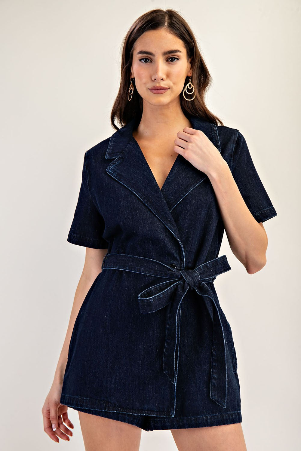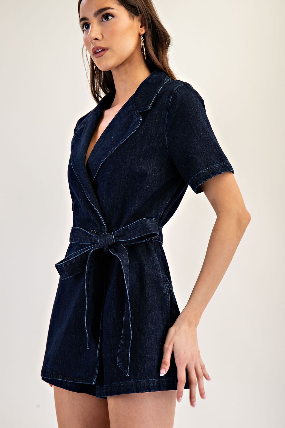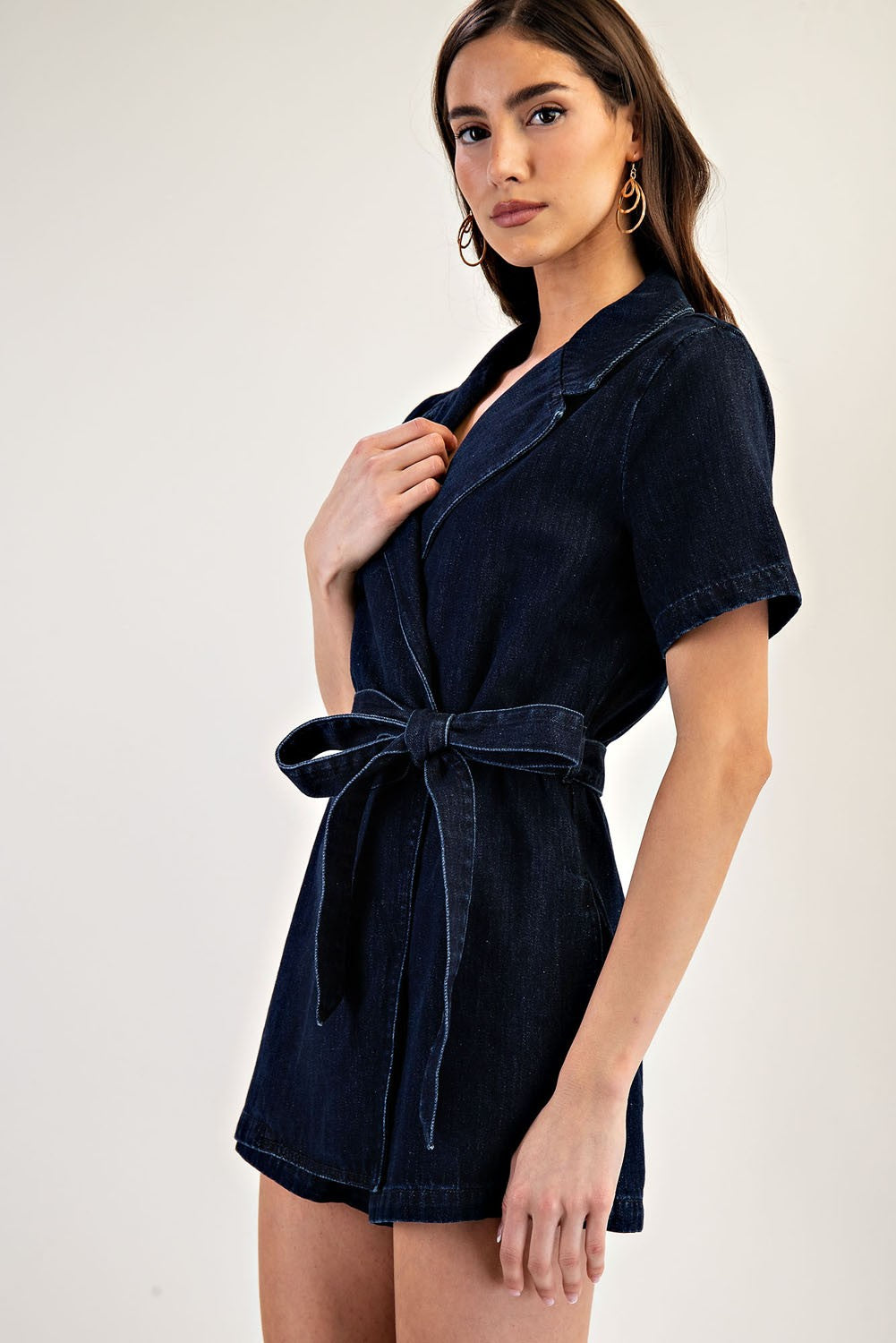 This mineral washed denim romper features a structured notched lapel, short sleeves, a tie waist belt for a customizable fit, side pockets for functionality, and a front wrap design that gives the illusion of a dress from the front, blending casual charm with polished style. Model is 5'9" and is wearing a small.