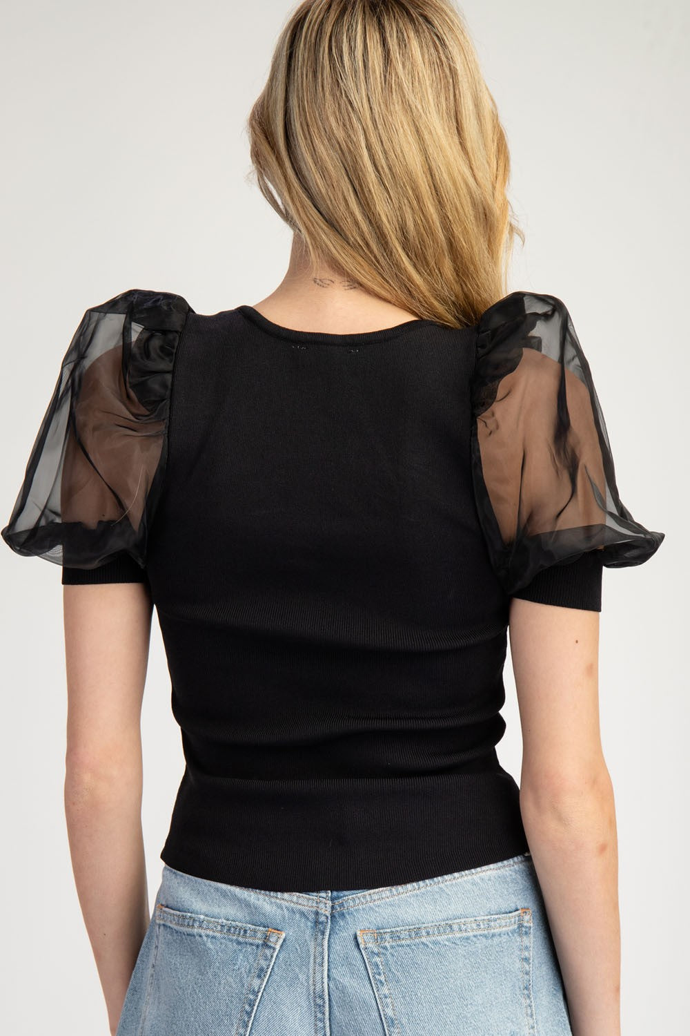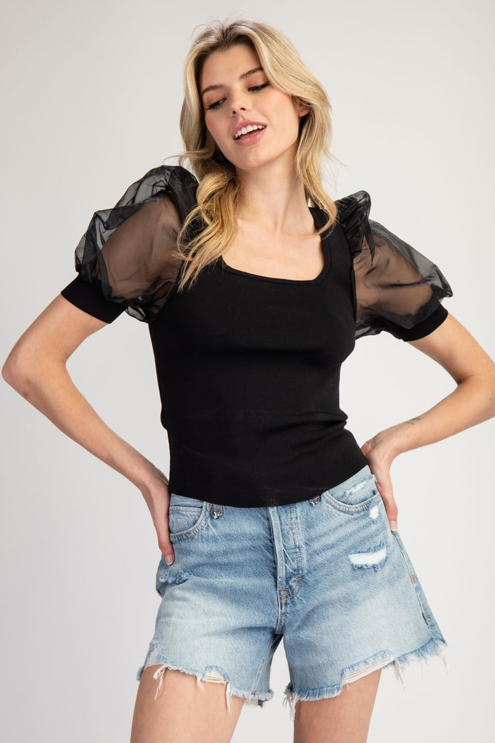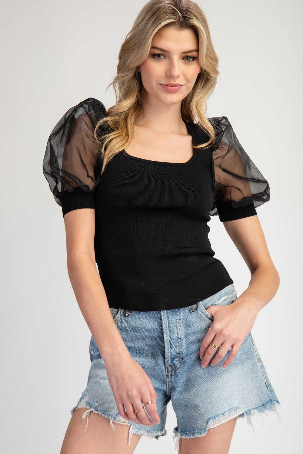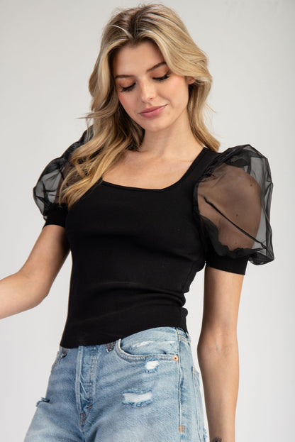 Solid short sleeve top featuring a square neckline, mesh puff sleeves, ribbed cuffs and is a slightly fitted body. Model is 5'8" and is wearing a small.