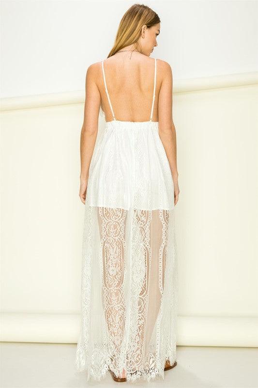THIS FLIRTY AND MAGICAL MAXI DRESS HAVE A FULL LACE OVERALL, MAKING IT PERFECT TO WEAR TO A SPECIAL OCCASION. A PLUNGING V-NECKLINE IS HELD TOGETHER WITH ADJUSTABLE SHOULDER STRAPS THAT LEAD TO A BACKLESS CUT. AN ELASTICIZED WAIST LEADS TO A FRONT CUTOUT IMPORTED. DESIGNED IN THE USA MODEL IS 5' 9" TALL, 34C" CHEST, 24" WAIST AND 35" HIPS AND WEARING A SIZE SMALL