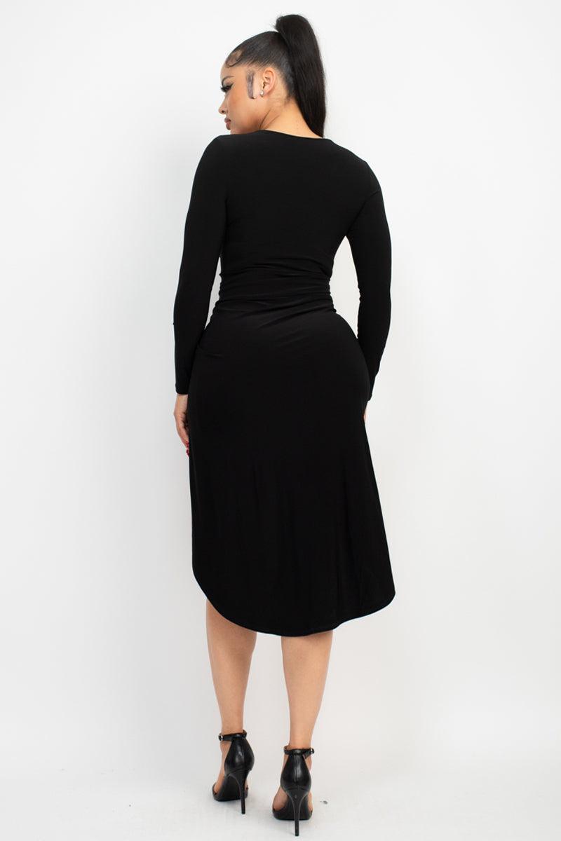 Details: A knit fashion dress in a solid color featuring a surplice neckline, long sleeves, front ruching details, a mini front skirt, and a maxi trail in the back