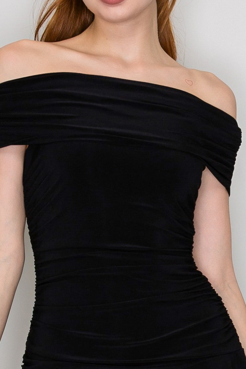This solid color mini dress features a strapless, off-shoulder neckline with short, gathered sleeve caps. The fitted bodice and waist are characterized by dense horizontal ruching for contour and shape. The skirt is cut in a short, tiered A-line silhouette that falls above the knee. The interior surface of the garment is smooth, facilitating an easy, gentle glide across the wearer's skin. Made in Cambodia