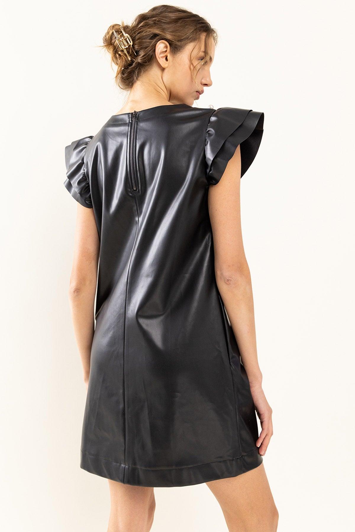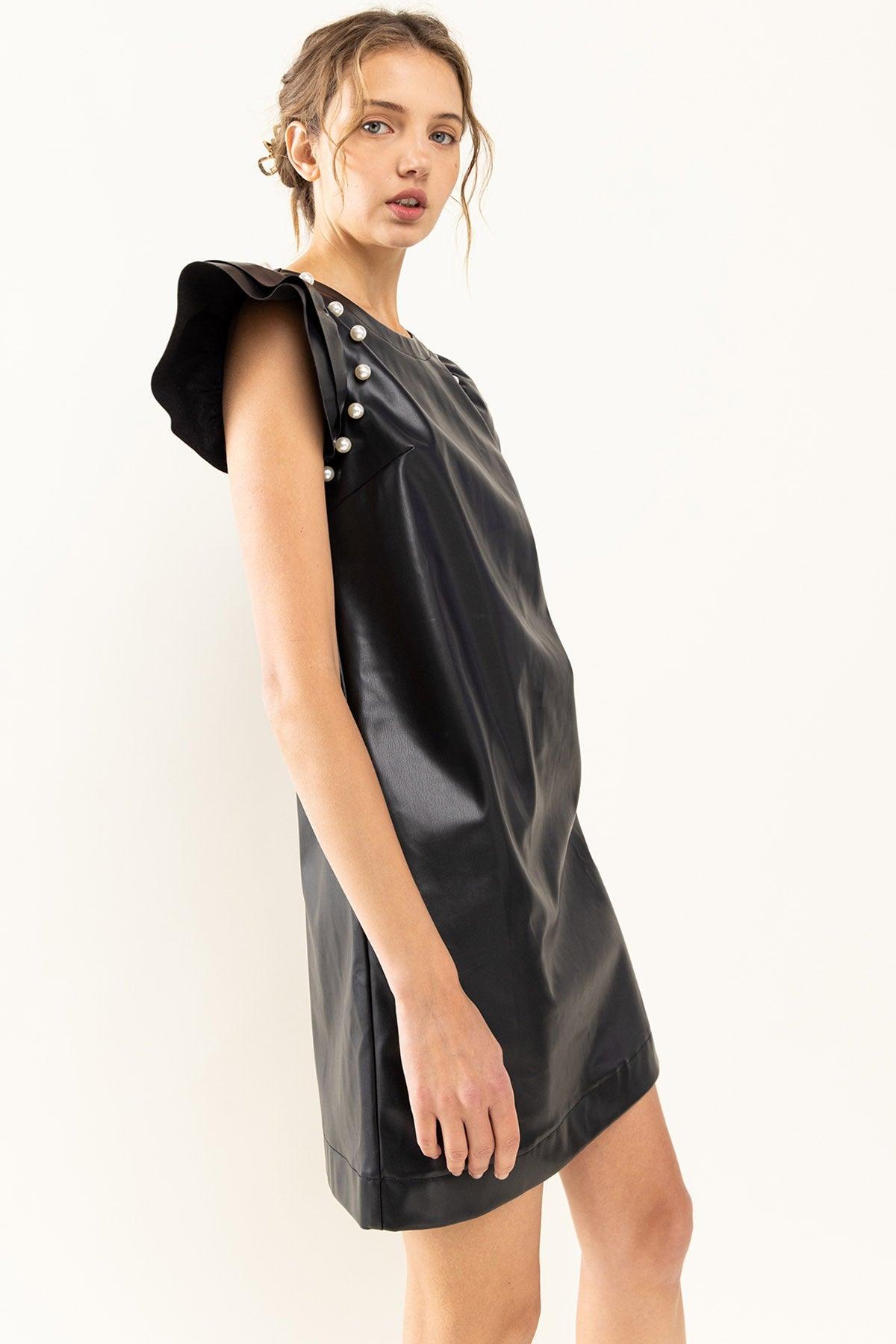 Soft Faux Leather Pearl Mini Dress -Soft vegan leather -Pearl detailed shoulder -Double layer sleeve -Ruffle detail -Round neck -Side pockets -Back zipper down