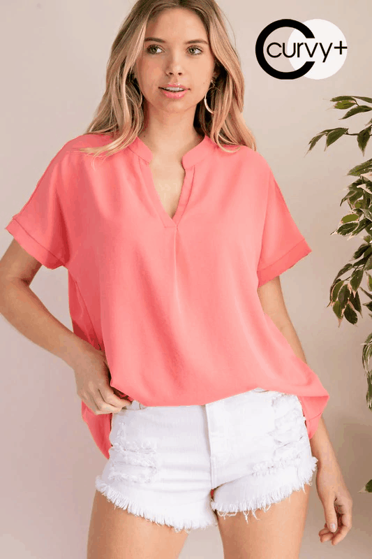 PLUS SIZE SOLID COLLARED WITH CENTER PLEAT DETAIL SHIRTTAIL HEM WOVEN SHIRT TOP
