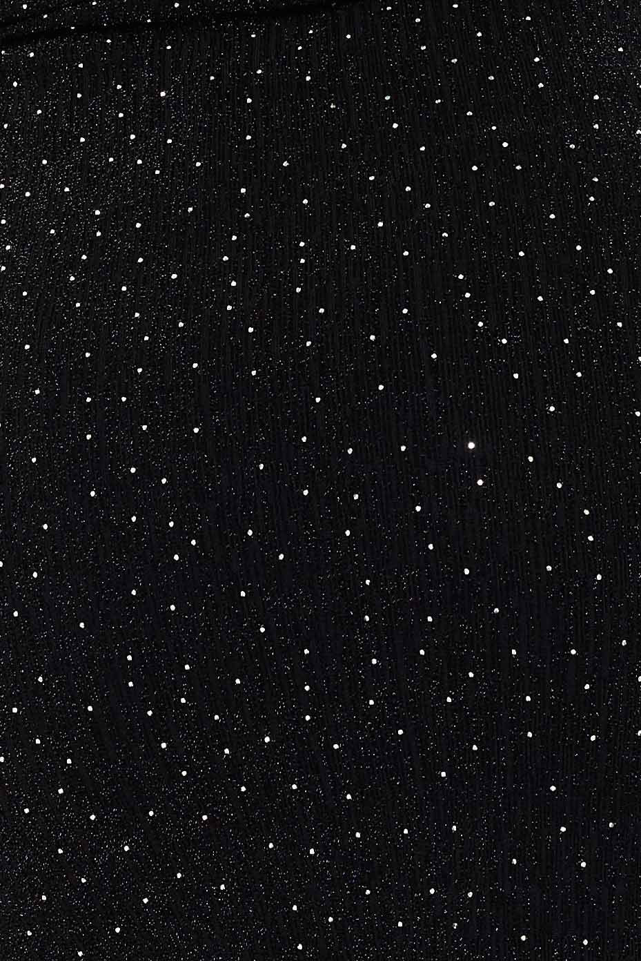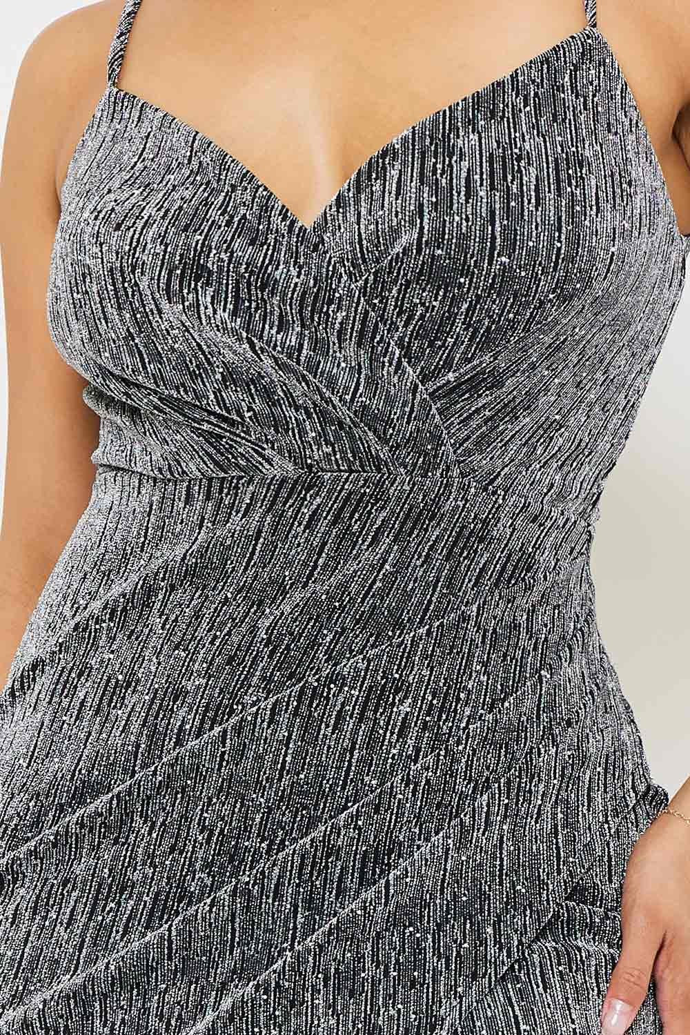 RHINESTONE ON METALLIC SURPLICE MAXI DRESS SPAGHETTI SHOULDER STRAP PLEATED WRAP SKIRT WITH OPENING IN THE FRONT LINING INSIDE SLIP ON MODERATE STRETCH MODEL: 5'8" IS WEARING IS A SMALL