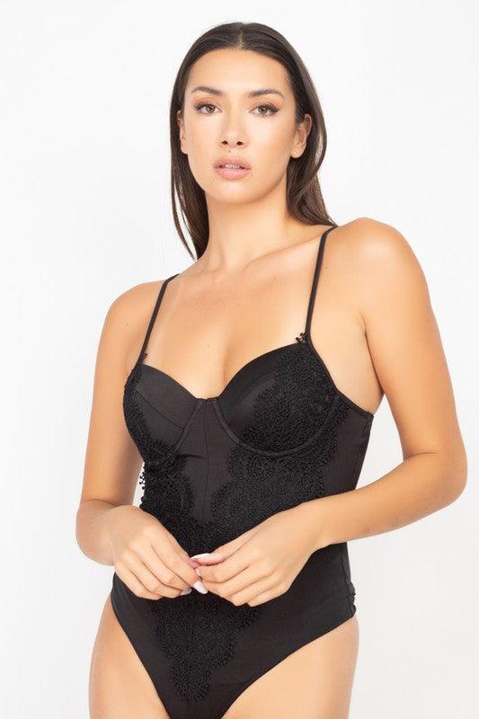 Details: A satin bodysuit featuring a sweetheart neckline, bustier bodice, embroidered lace details, padded cup, and cami straps. Made in China