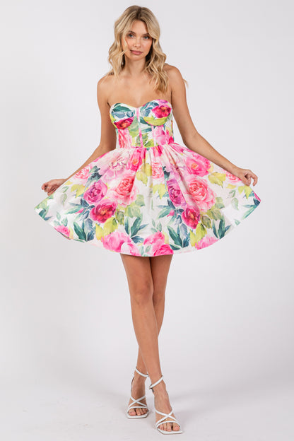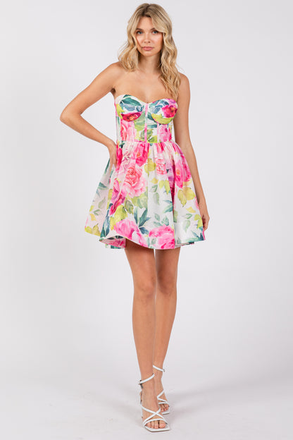 Flower Tube Bra Cup A Line Mini Dress -Mini Length -Tube Top -Bra Cup Detail -Floral Print -Multi-Color -Smocking Back -Back Zipper -Ruffle Details -Flowy -Bodycon -Fitted -Lined