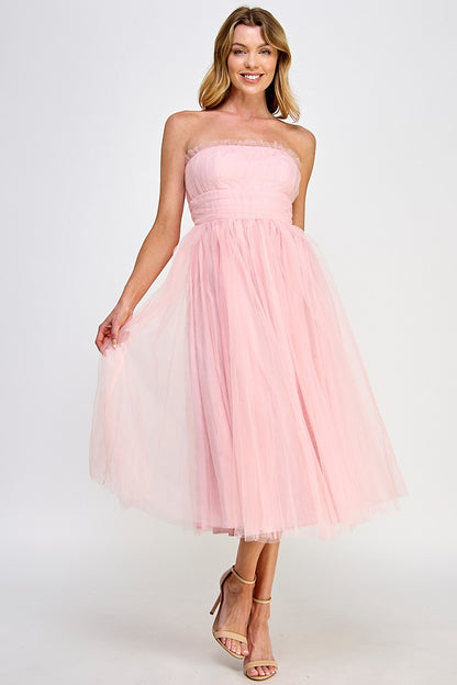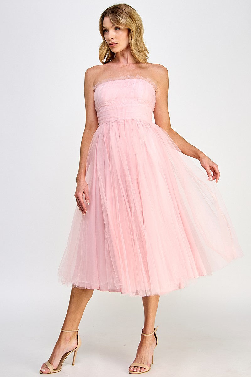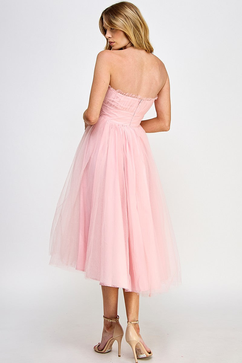 - Strapless - Layered - Midi length - Tulle silhouette - Back zipper