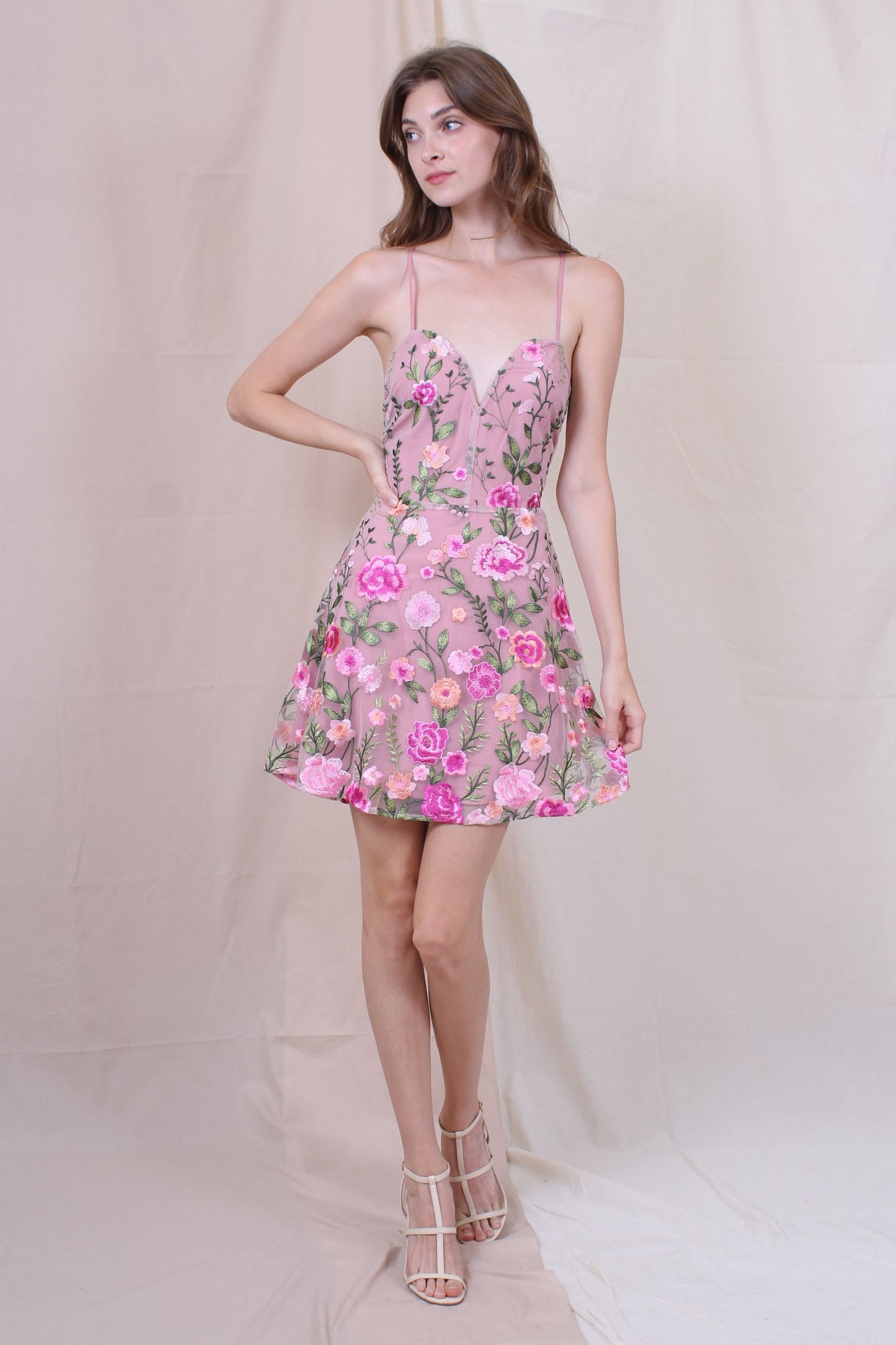 EMBROIDERED FLORAL & LEAF PRINT SWEETHEART V NECKLINE THING SPAGHETTI STRAPS EXPOSED CRISS-CROSS BACK MINI LENGTH KEYWORDS: DERBY DRESS, GARDEN PARTY DRESS, TEA PARTY DRESS, FLORAL PRINT MINI DRESS, FLORAL DRESS, FLORAL PRINT DRESS, MINI DRESS, EMBROIDERED DRESS, SPRING DRESS, SUMMER DRESS, DRESSY DRESS, PARTY DRESS