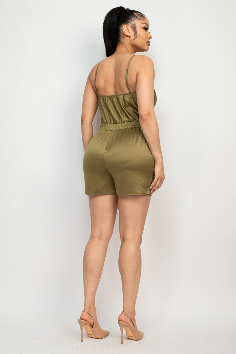 A woven satin romper in solid color and trendy online bestseller featuring a cowl neckline, adjustable cami straps, cinched waist, side pockets, and mini-length. Made in Egypt