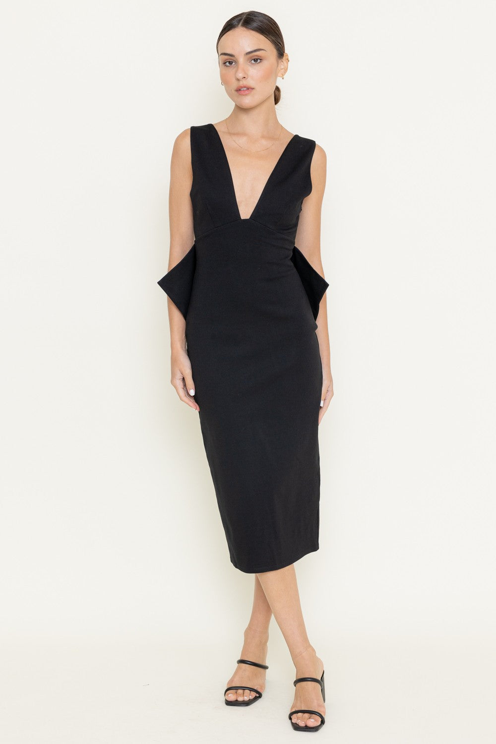 DEEP NECK SLEEVELESS BOW BACK MIDI DRESS