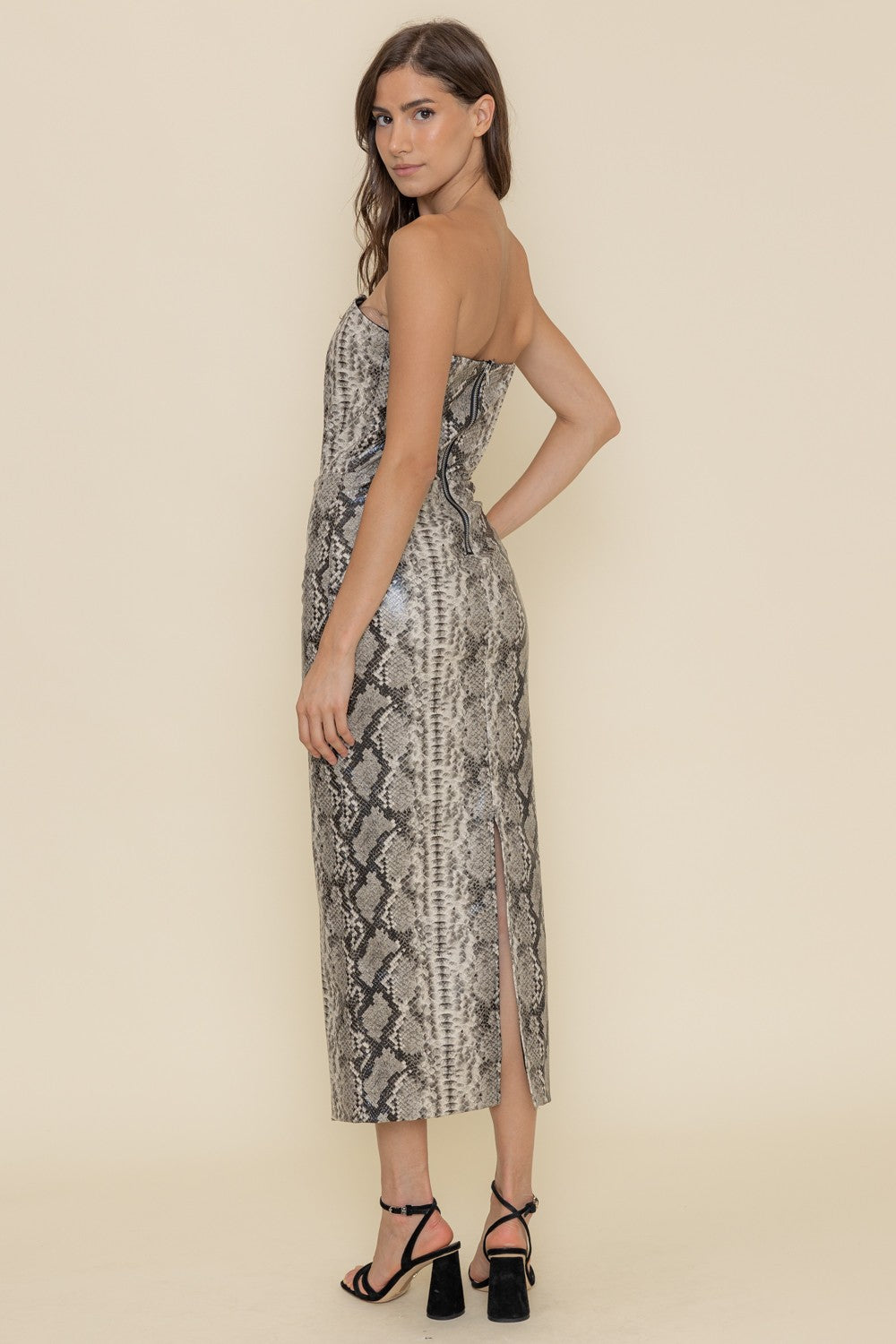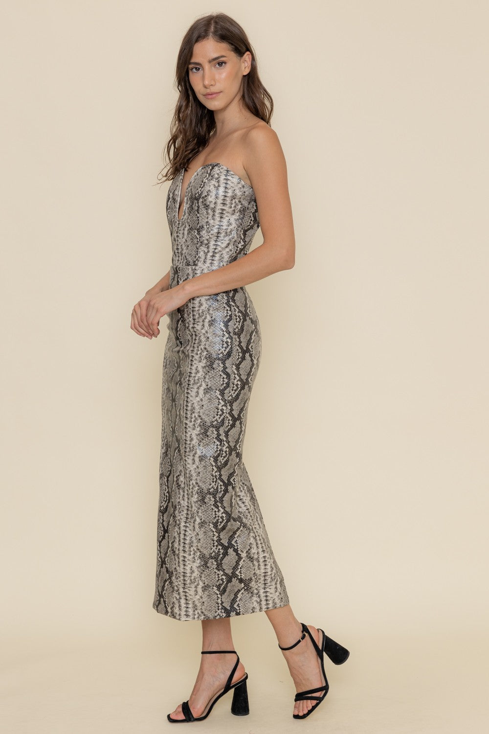 FAUX LEATHER SNAKE PRINT WIRED STRAPLESS MIDI DRESS