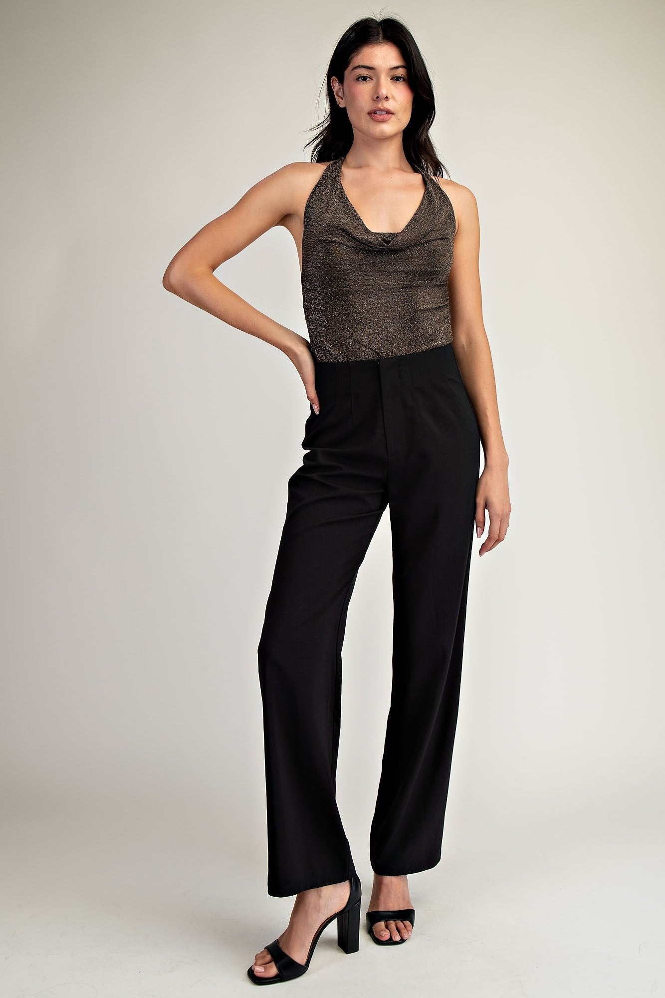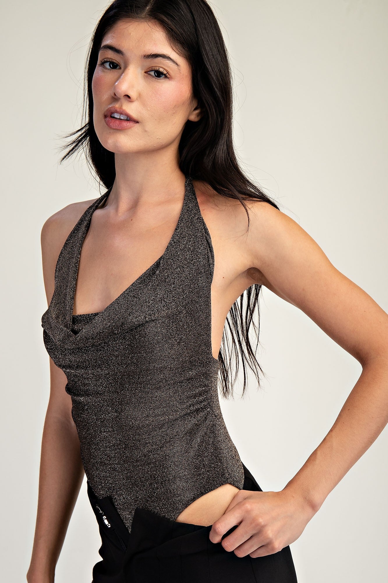 LUREX KNIT COWL NECK HALTER BODYSUIT