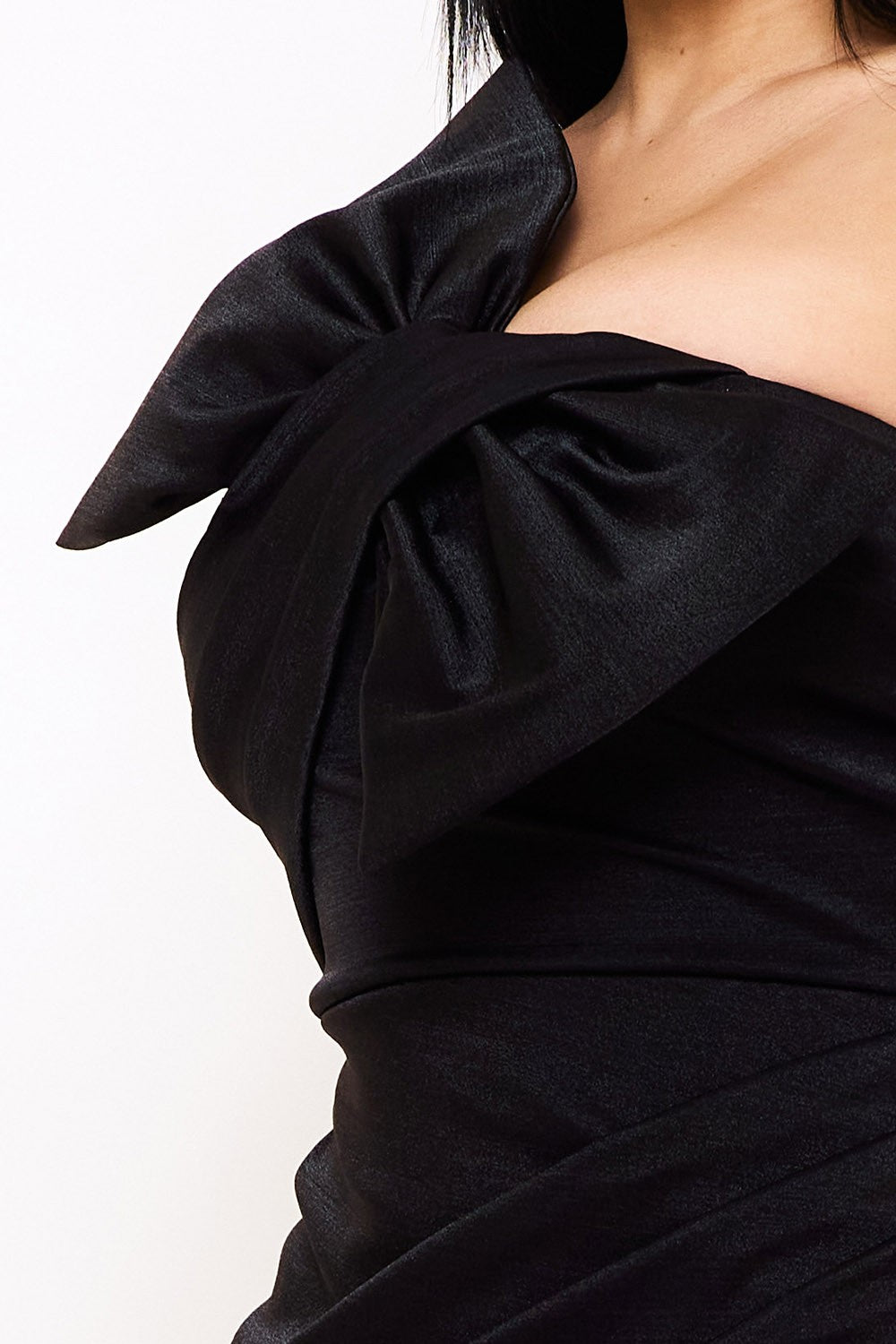METALLIC TRICOT BIG BOW FRONT MINI DRESS ONE SHOULDER STRAP TULIP HEM ZIPPER BACK MODERATE STRETCH MODEL: 5'8" IS WEARING IS A SMALL