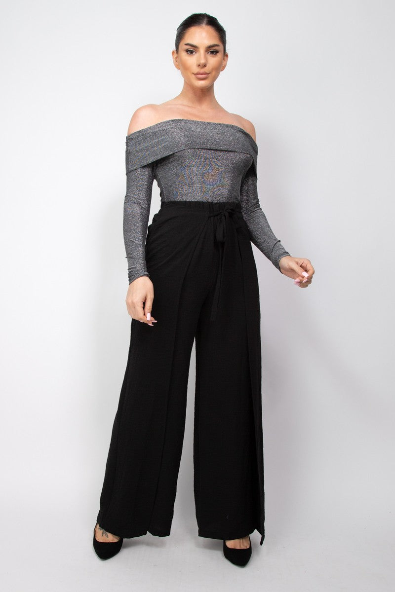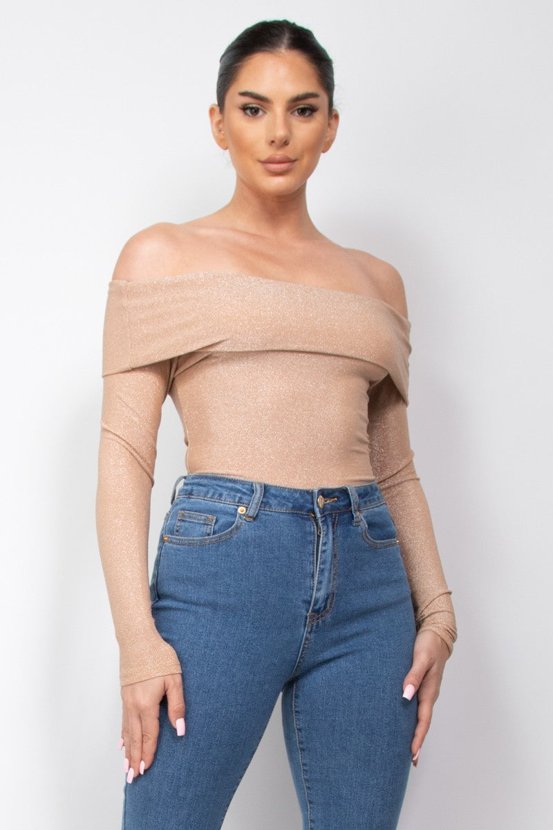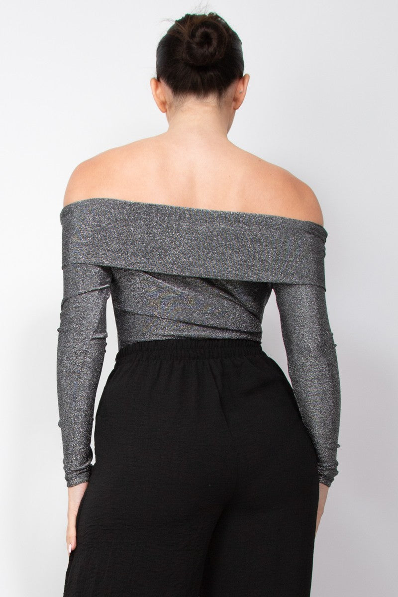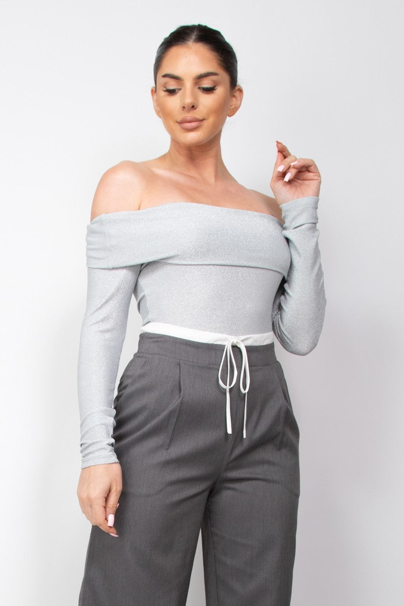 Off-Shoulder Glittery Long Sleeve Bodysuit
