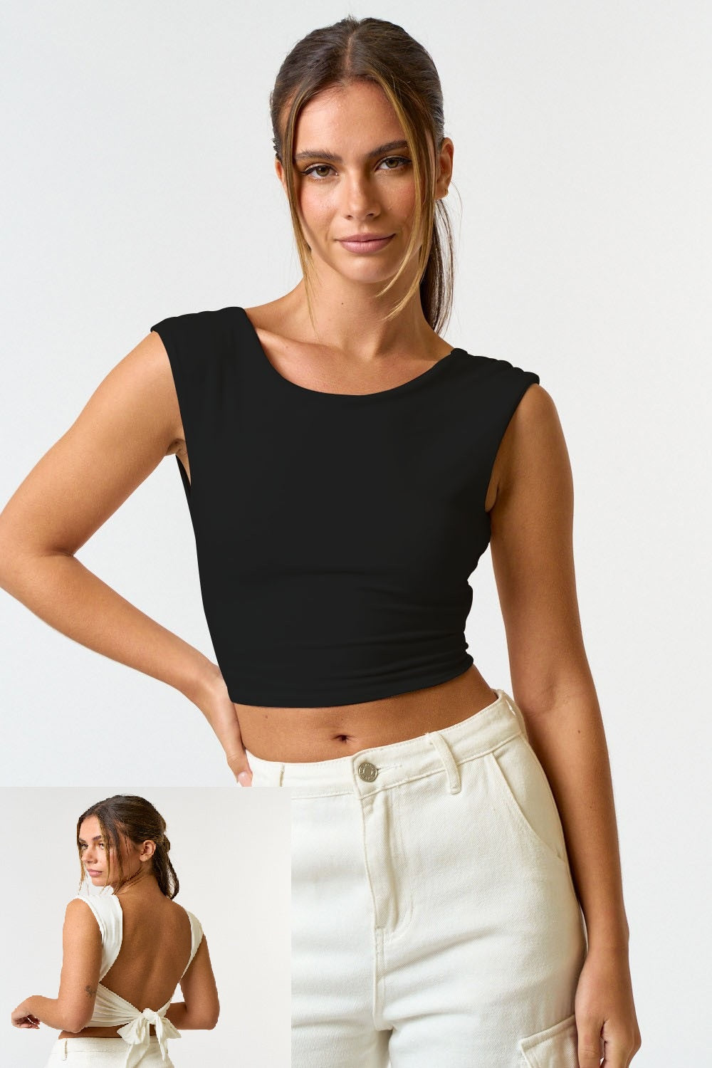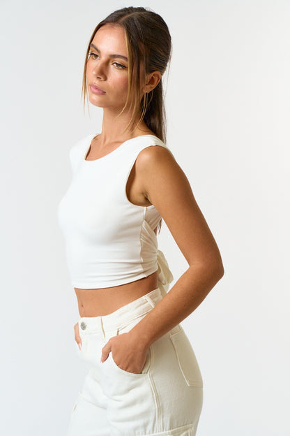 SLEEVELESS BRUSHED KNIT TOP WITH ADJUSTABLE OPEN BACK DETAIL - STRETCH FABRIC - KNIT CROP TOP