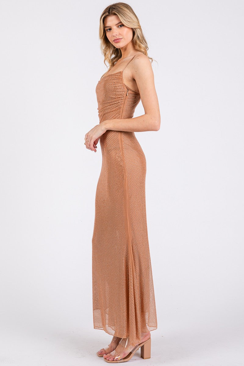 Mocha power mesh dress with rhinestone details, adjustable spaghetti straps, hidden side zipper, and a sheer, floor-length design for a glamorous look. -Side Zipper -Bodycon -Fitted -Lined