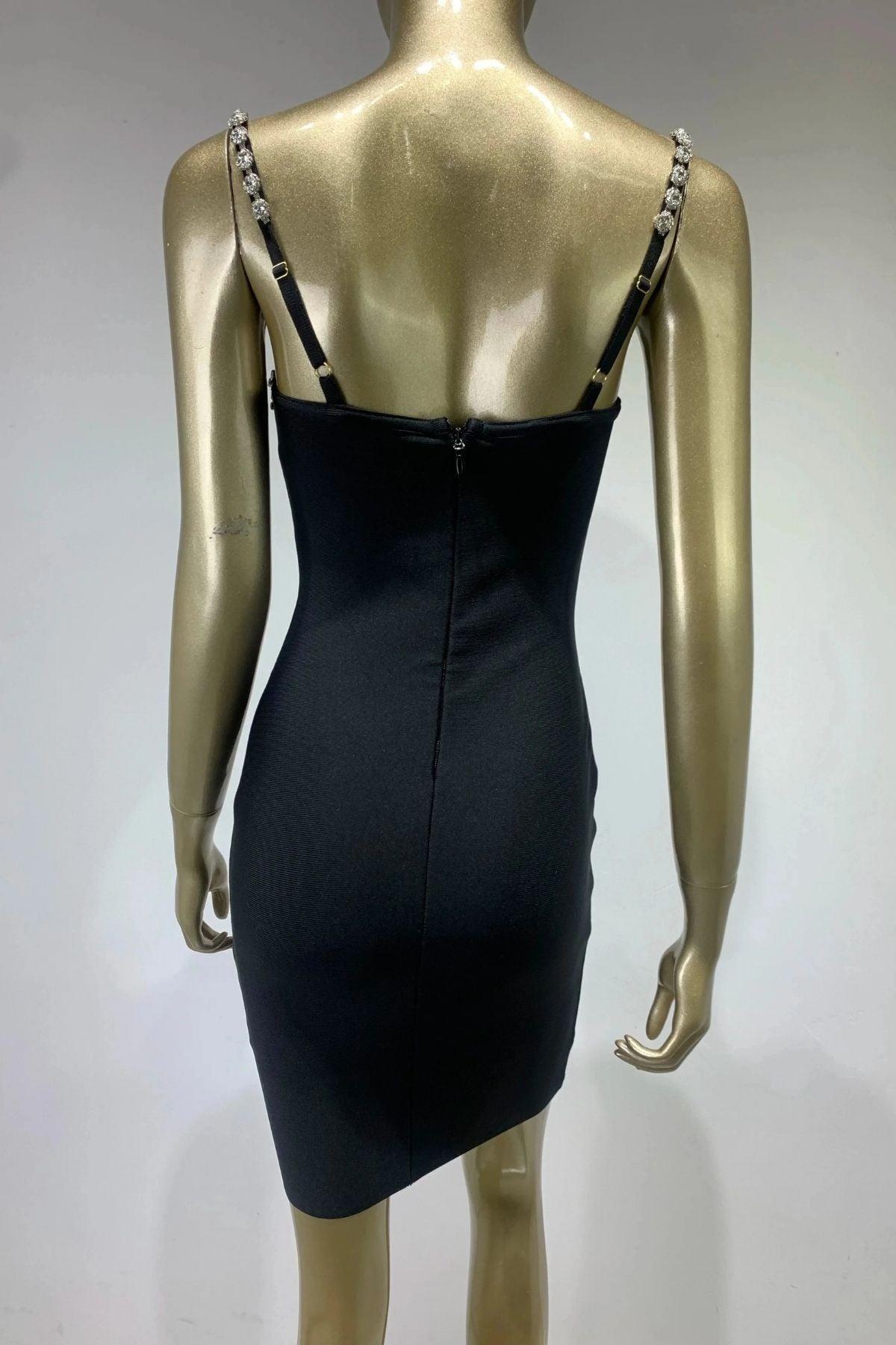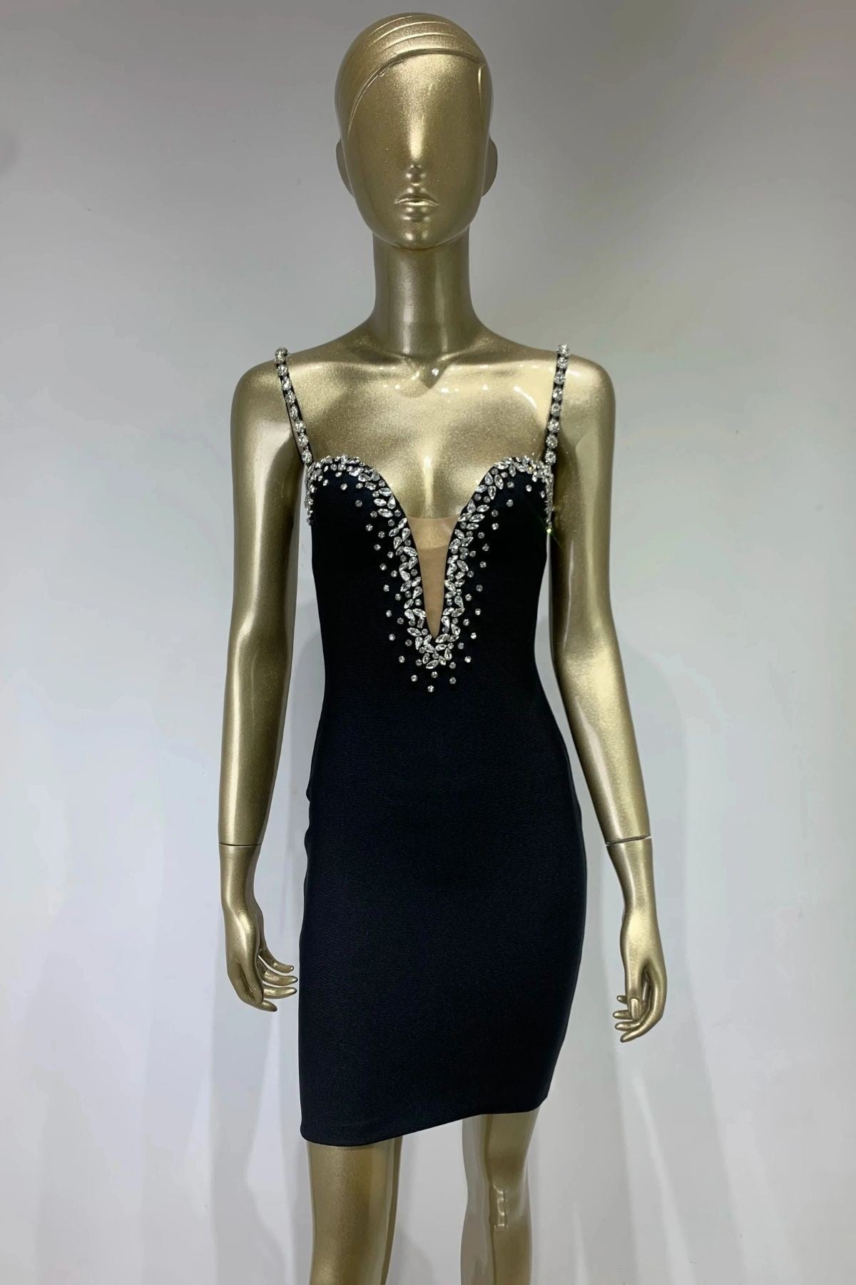 High Quality Deep V Neck Crystal Spaghetti Straps Stretch Black Bandage Dress Elasticity: High Strecth Sleeve Style: Strapless Fabric Type: Knitting Pattern Type: Solid Fit Type: Slim Silhouette: Sheath