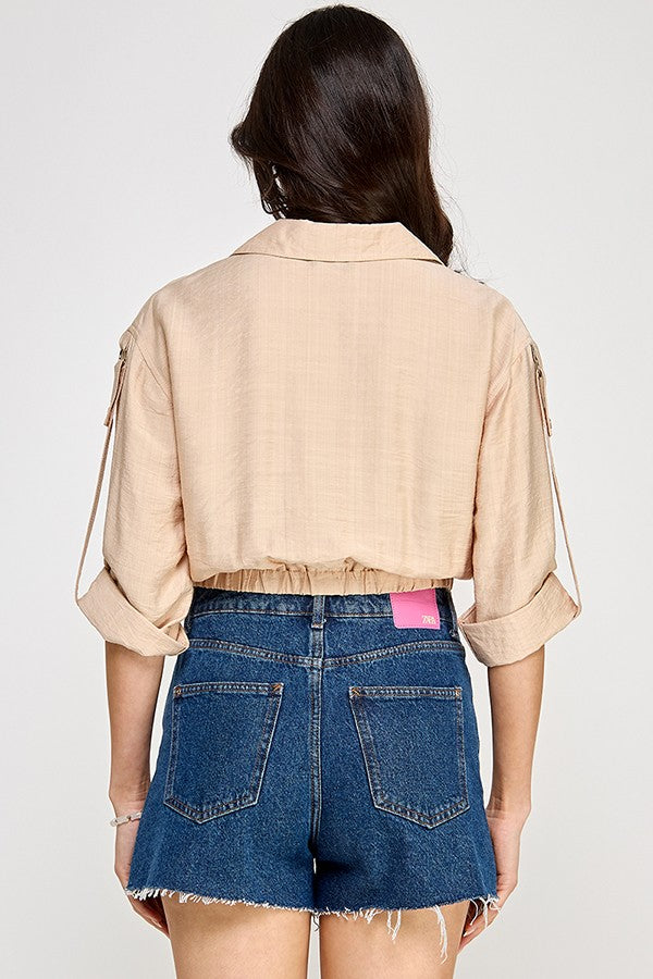 3/4 Sleeve Button Down Top With Roll Up Strap