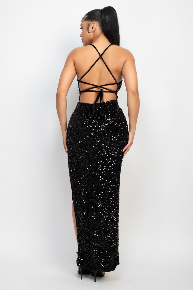 Sequin Back-Tie Slit Maxi Dress