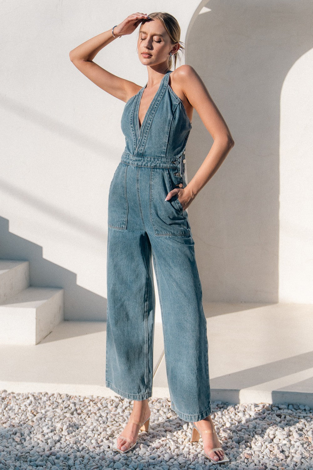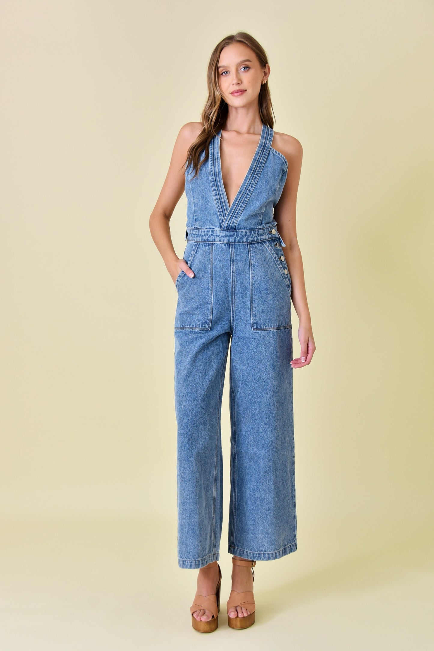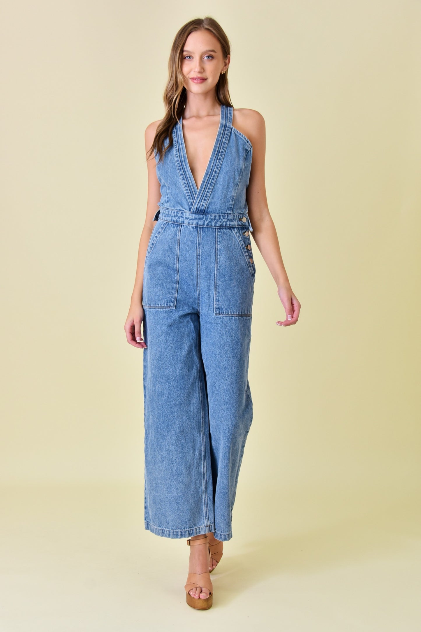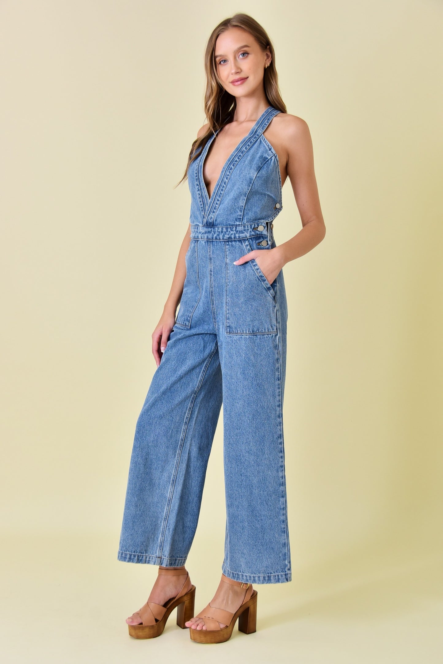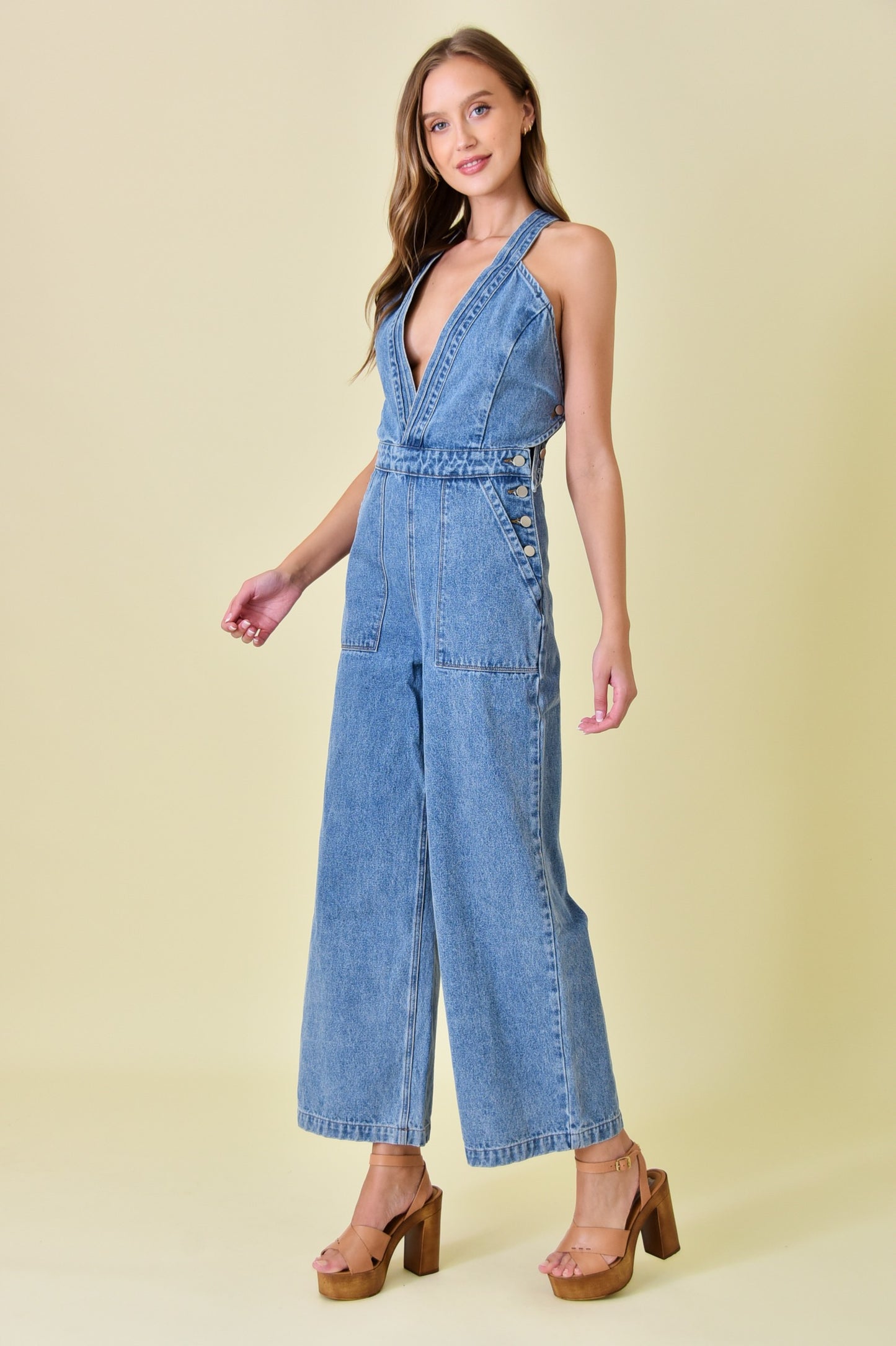 - Denim - Deep v-neckline - Criss-cross back silhouette - Wide leg style - Full length - Side button closure
