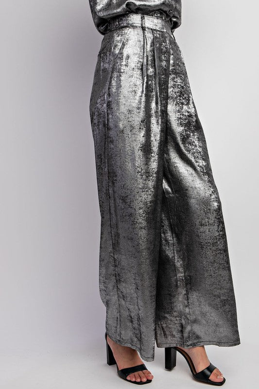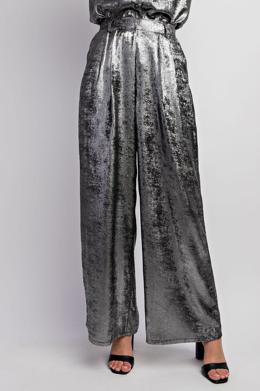 SHIMMER WOVEN LONG WIDE LEG PANTS PLEATS