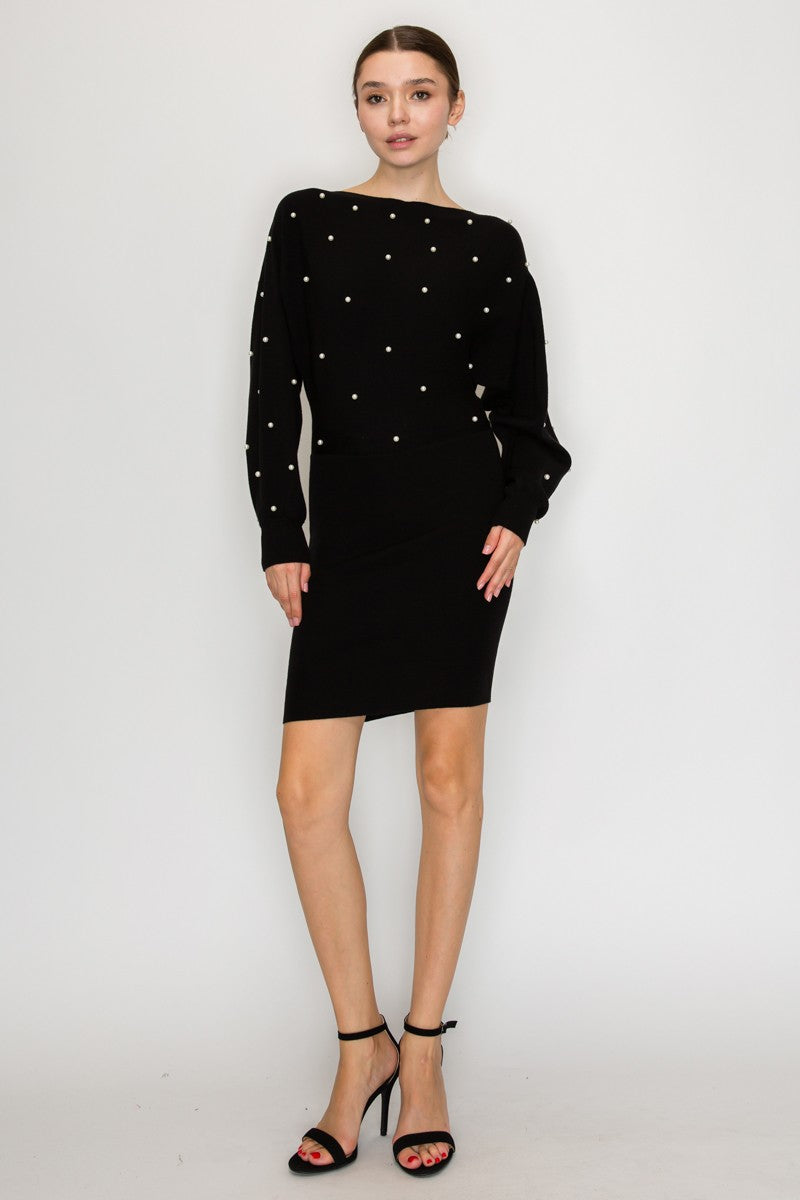 A long sleeve sweater dress with pearl pattern featuring straight neckline, long cuffed sleeves, loose fit upper bodice and a fitted lower bodice, cinched waist, and a mini length. Made in China