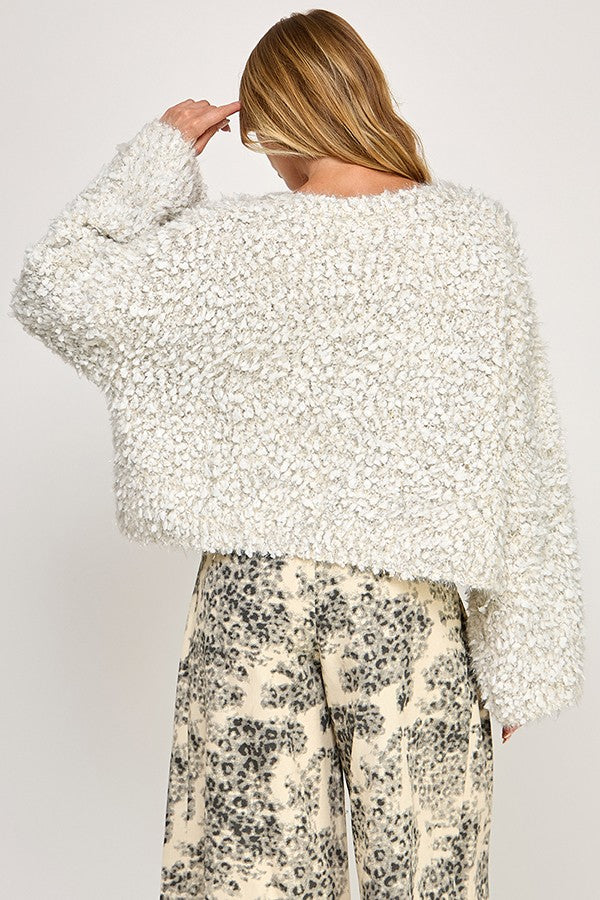 -Moderate V-neckline Fuzzy Sweater -Relaxed and slightly boxy for comfort -Cropped, hitting slightly above the hips or at the top of high-rise bottoms -Full-length sleeves -Soft, feminine, and tactile with a playful yet luxe appeal
